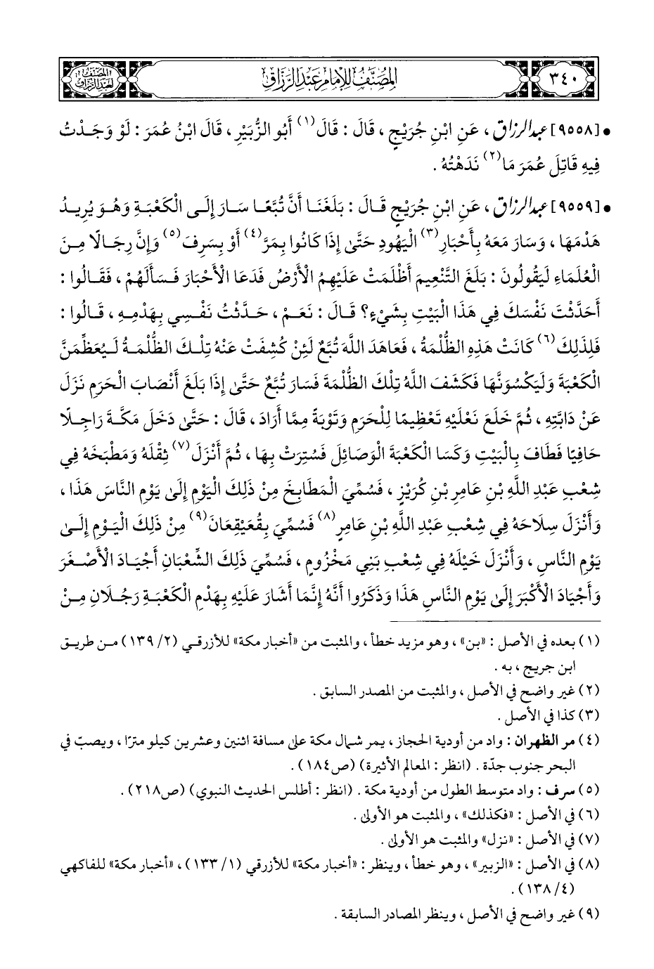• [٩٥٥٩] عبد الرزاق، عَنِ ابْنِ جُرَيْجٍ قَالَ: بَلَغَنَا أَنَّ تُبَّعًا سَارَ إِلَى الْكَعْبَةِ وَهُوَ يُرِيدُ هَدْمَهَا، وَسَارَ مَعَهُ بِأَحْبَارِ (¬٣) الْيَهُودِ حَتَّى إِذَا كَانُوا بِمَرَّ (¬٤) أَوْ بِسَرِفَ (¬٥) وإِنَّ رِجَالًا مِنَ الْعُلَمَاءَ لَيَقُولُونَ: بَلَغَ التَّنْعِيمَ أَظْلَمَتْ عَلَيْهِمُ الْأَرْضُ فَدَعَا الْأَحْبَارَ فَسَأَلَهُمْ، فَقَالُوا: أَحَدَّثْتَ نَفْسَكَ فِي هَذَا الْبَيْتِ بِشَيءٍ؟ قَالَ: نَعَمْ، حَدَّثْتُ نَفْسِي بِهَدْمِهِ، قَالُوا: فَلِذَلِكَ (¬٦) كَانَتْ هَذِهِ الظُّلْمَةُ، فَعَاهَدَ اللَّهَ تُبَّعٌ لَئِنْ كُشِفَتْ عَنْهُ تِلْكَ الظُّلْمَةُ لَيُعَظِّمَنَّ الْكَعْبَةَ وَلَيَكْسُوَنَّهَا فَكَشَفَ اللهُ تِلْكَ الظُّلْمَةَ فَسَارَ تُبَّع حَتَّى إِذَا بَلَغَ أَنْصَابَ الْحَرَمِ نَزَلَ عَنْ دَابَّتِهِ، ثُمَّ خَلَعَ نَعْلَيْهِ تَعْظِيمًا لِلْحَرَمِ وَتَوْبَةً مِمَّا أَرَادَ، قَالَ: حَتَّى دَخَلَ مَكَّةَ رَاجِلًا حَافِيًا فَطَافَ بِالْبَيْتِ وَكَسَا الْكَعْبَةَ الْوَصَائِلَ فَسُتِرَتْ بِهَا، ثُمَّ أَنْزَلَ (¬٧) ثِقْلَهُ وَمَطْبَخَهُ فِي شِعْبِ عَبْدِ اللَّهِ بْنِ عَامِرِ بْنِ كُرَيْزٍ، فَسُمِّيَ الْمَطَابِخَ مِنْ ذَلِكَ الْيَوْمِ إِلَى يَوْمِ النَّاسَ هَذَا، وَأَنْزَلَ سِلَاحَهُ فِي شِعْبِ عَبْدِ اللهِ بْنِ عَامِرٍ (¬٨) فَسُمِّيَ بِقُعَيْقِعَانَ (¬٩) مِنْ ذَلِكَ الْيَوْمِ إِلَى يَوْمِ النَّاسِ، وَأَنْزَلَ خَيْلَهُ فِي شِعْبِ بَنِي مَخْزُومٍ، فَسُمِّيَ ذَلِكَ الشِّعْبَانِ أَجْيَادَ الْأَصْغَرَ وَأَجْيَادَ الْأكْبَرَ إِلَى يَوْمِ النَّاسِ هَذَا وَذَكَرُوا أَنَّهُ إِنَّمَا أَشَارَ عَلَيْهِ بِهَدْمِ الْكَعْبَةِ رَجُلَانِ مِنْ