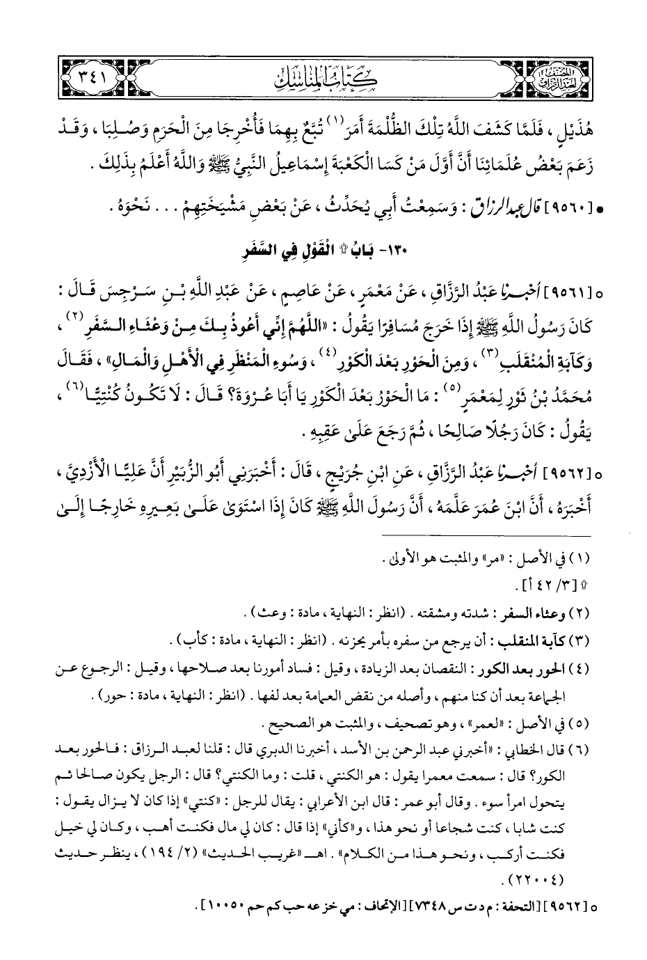 ° [٩٥٦١] أخبرنا عَبْدُ الرَّزَّاقِ، عَنْ مَعْمَرٍ، عَنْ عَاصِمٍ، عَنْ عَبْدِ اللهِ بْنِ سَرْجِسَ قَالَ: كَانَ رَسُولُ اللهِ - صلى الله عليه وسلم - إِذَا خَرَجَ مُسَافِرًا يَقُولُ: "اللَّهُمَّ إِنِّي أَعُوذُ بِكَ مِنْ وَعْثَاءِ السَّفَرِ (¬٢)، وَكَآبَةِ الْمُنْقَلَبِ (¬٣)، وَمِنَ الْحَوْرِ بَعْدَ الْكَوْرِ (¬٤)، وَسُوءِ الْمَنْظَرِ فِي الْأَهْلِ وَالْمَالِ"، فَقَالَ مُحَمَّدُ بْنُ ثَوْر لِمَعْمَرٍ (¬٥): مَا الْحَوْرُ بَعْدَ الْكَوْر يَا أَبَا عُرْوَةَ؟ قَالَ: لَا تَكُونُ كُنْتِيًّا (¬٦)، يَقُولُ: كَانَ رَجُلًا صَالِحًا، ثُمَّ رَجَعَ عَلَى عَقِبِهِ.