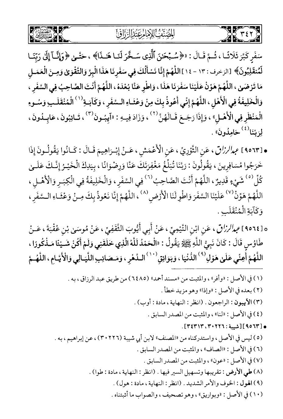 • [٩٥٦٣] عبد الرزاق، عَنِ الثَّوْرِيِّ، عَنِ الْأَعْمَشِ، عَنْ إِبْرَاهِيمَ قَالَ: كَانُوا يَقُولُونَ إِذَا خَرَجُوا مُسَافِرِينَ، يَقُولُونَ: رَبَّنَا تُبَلِّغُ مَغْفِرَتَكَ عَنَّا وَرِضوَانًا، بِيَدِكَ الْخَيْرُ إِنَّكَ عَلَى كُلِّ (¬٥) شَيءٍ قَدِيرٌ، اللَّهُمَّ أَنْتَ الصَّاحِبُ (¬٦) فِي السَّفَرِ، وَالْخَلِيفَةُ فِي الْكِبَرِ وَالْأَهْلِ، اللَّهُمَّ هَوِّنْ (¬٧) عَلَيْنَا السَّفَرَ وَاطْوِ لَنَا الْأَرْضِ (¬٨)، اللَّهُمَّ إِنَّا نَعُوذُ بِكَ مِنْ وَعْثَاءِ السَّفَرِ، وَكَآبَةِ الْمُنْقَلَبِ.