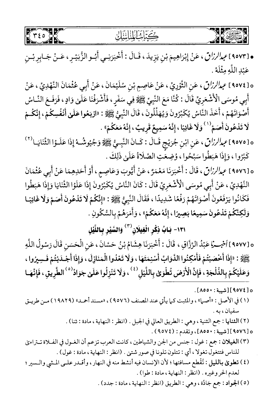 ° [٩٥٧٦] عبد الرزاق، قَالَ: أَخْبَرَنَا مَعْمَرٌ، عَنْ أَيُّوبَ وَعَاصِمٍ، أَوْ أَحَدِهِمَا عَنْ أَبِي عُثْمَانَ النَّهْدِيِّ، عَنْ أَبِي مُوسَى الْأَشْعَرِيِّ قَالَ: كَانَ النَّاسُ يُكَبِّرُونَ إِذَا عَلَوُا الثَّنَايَا وإِذَا هَبَطُوا فَكَانُوا يَرْفَعُونَ أَصْوَاتَهُمْ رَفْعًا شَدِيدًا، فَقَالَ النَّبِيُّ - صلى الله عليه وسلم -: "إِنَّكُمُ لَا تَدْعُونَ أَصَمَّ وَلَا غَائِبًا وَلَكِنَّكمْ تَدْعُونَ سَمِيعًا بَصِيرًا، إِنَّهُ مَعَكُمْ"، وَأَمَرَهُمْ بِالسُّكُونِ.