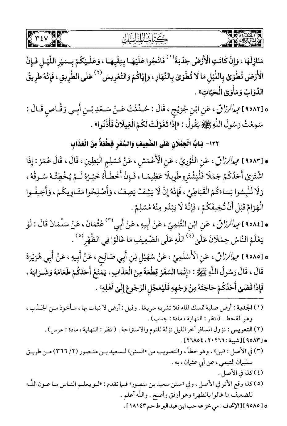 ١٣٢ - بَابُ الْحِمْلَانِ عَلَى الضَّعِيفِ وَالسَّفَرِ قِطْعَةٌ مِنَ الْعَذَابِ