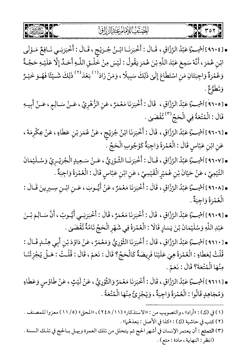 • [٩٦٠٤] أخبرنا عَبْدُ الرَّزَّاقِ، قَالَ: أَخْبَرَنَا ابْنُ جُرَيْجٍ، قَالَ: أَخْبَرَنِي نَافِعٌ مَوْلَى ابْنِ عُمَرَ، أَنَّهُ سَمِعَ عَبْدَ اللهِ بْنَ عُمَرَ يَقُولُ: لَيْسَ مِنْ خَلْقِ اللَّهِ أَحَدٌ إِلَّا عَلَيْهِ حَجَّةٌ وَعُمْرَةٌ وَاجِبَتَانِ مَنِ اسْتَطَاعَ إِلَى ذَلِكَ سَبِيلًا، وَمَنْ زَادَ (¬١) بَعْدَ (¬٢) ذَلِكَ شَيْئًا فَهُوَ خَيْرٌ وَتَطَوُّعٌ.