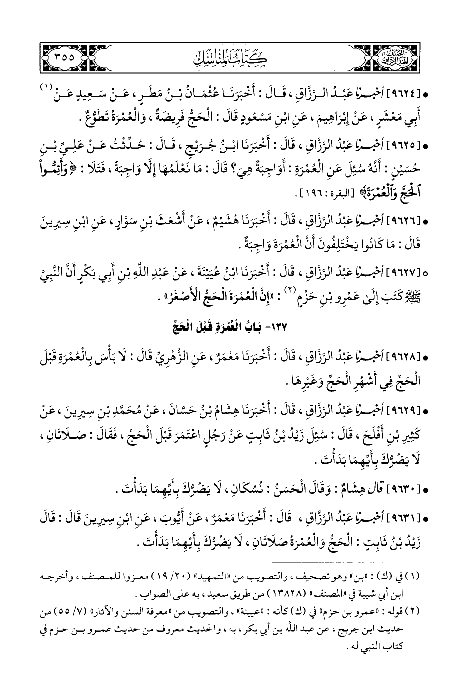° [٩٦٢٧] أخبرنا عَبْدُ الرَّزَّاقِ، قَالَ: أَخْبَرَنَا ابْنُ عُيَيْنَةَ، عَنْ عَبْدِ اللهِ بْنِ أَبِي بَكْرٍ أَنَّ النَّبِيَّ - صلى الله عليه وسلم - كَتَبَ إِلَى عَمْرِو بْنِ حَزْمٍ (¬٢): "إِنَّ الْعُمْرَةَ الْحَجُّ الْأَصْغَرُ".