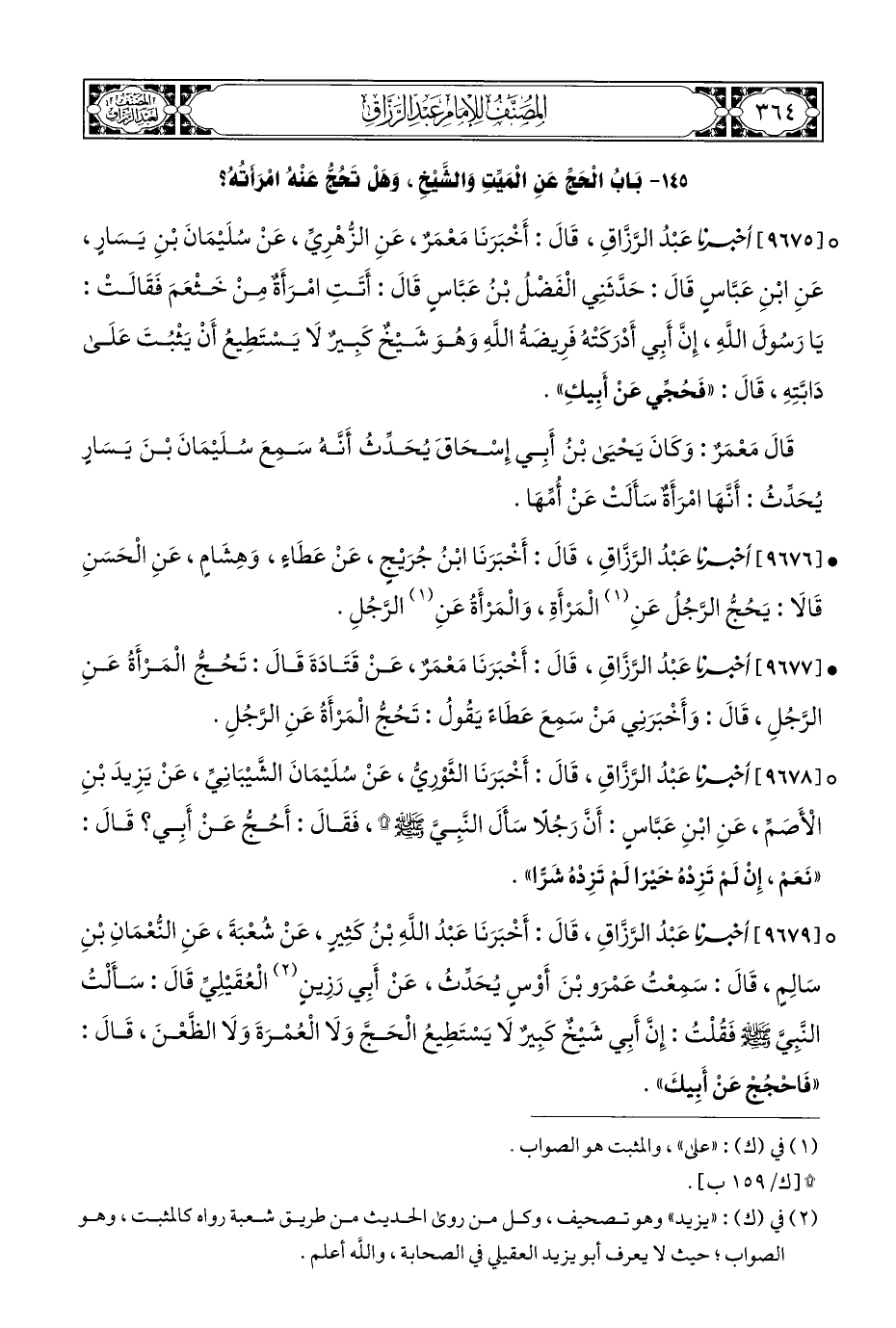 • [٩٦٧٦] أخبرنا عَبْدُ الرَّزَّاقِ، قَالَ: أَخْبَرَنَا ابْنُ جُرَيْجٍ، عَنْ عَطَاءٍ، وَهِشَامٍ، عَنِ الْحَسَنِ قَالَا: يَحُجُّ الرَّجُلُ عَنِ (¬١) الْمَرْأَةِ، وَالْمَرْأَةُ عَنِ (¬١) الرَّجُلِ.