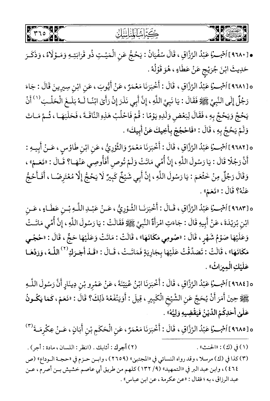 (¬٣) كذا في (ك) مرسلا، وقد رواه النسائي في "المجتبى" (٢٦٥٩)، وابن حزم في "حجة الوداع" (ص ٤٦٤)، وابن عبد البر في "التمهيد" (٩/ ١٣٢) كلهم من طريق أبي عاصم خشيش بن أصرم، عن عبد الرزاق، به؛ فقال: "عن عكرمة، عن ابن عباس".