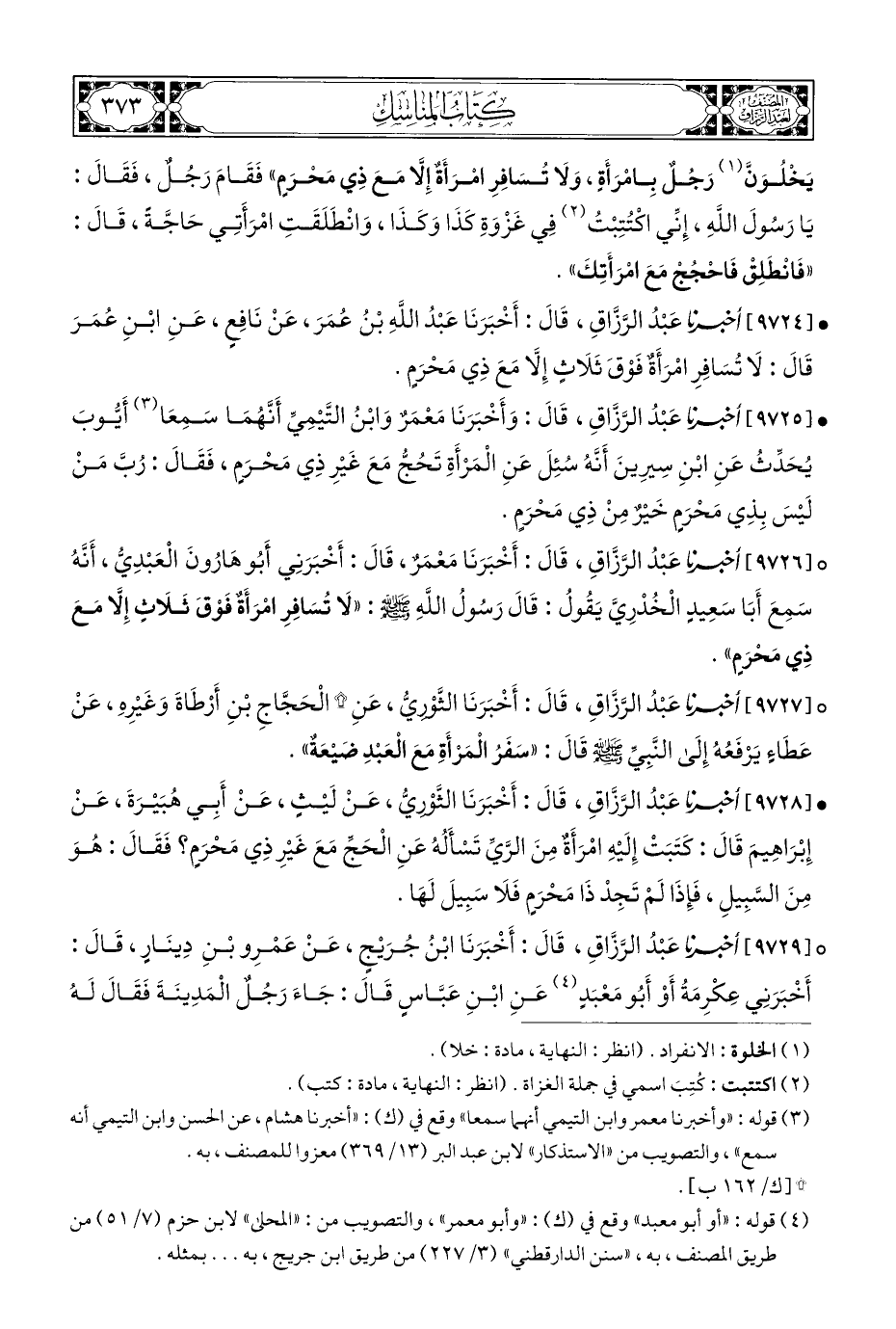 ° [٩٧٢٦] أخبرنا عَبْدُ الرَّزَّاقِ، قَالَ: أَخْبَرَنَا مَعْمَرٌ، قَالَ: أَخْبَرَنِي أَبُو هَارُونَ الْعَبْدِيُّ، أَنَّهُ سَمِعَ أَبَا سَعِيدٍ الْخُدْرِيَّ يَقُولُ: قَالَ رَسُولُ اللهِ - صلى الله عليه وسلم -: "لَا تُسَافِرِ امْرَأَةٌ فَوْقَ ثَلَاثٍ إِلَّا مَعَ ذِي مَحْرَمٍ".
