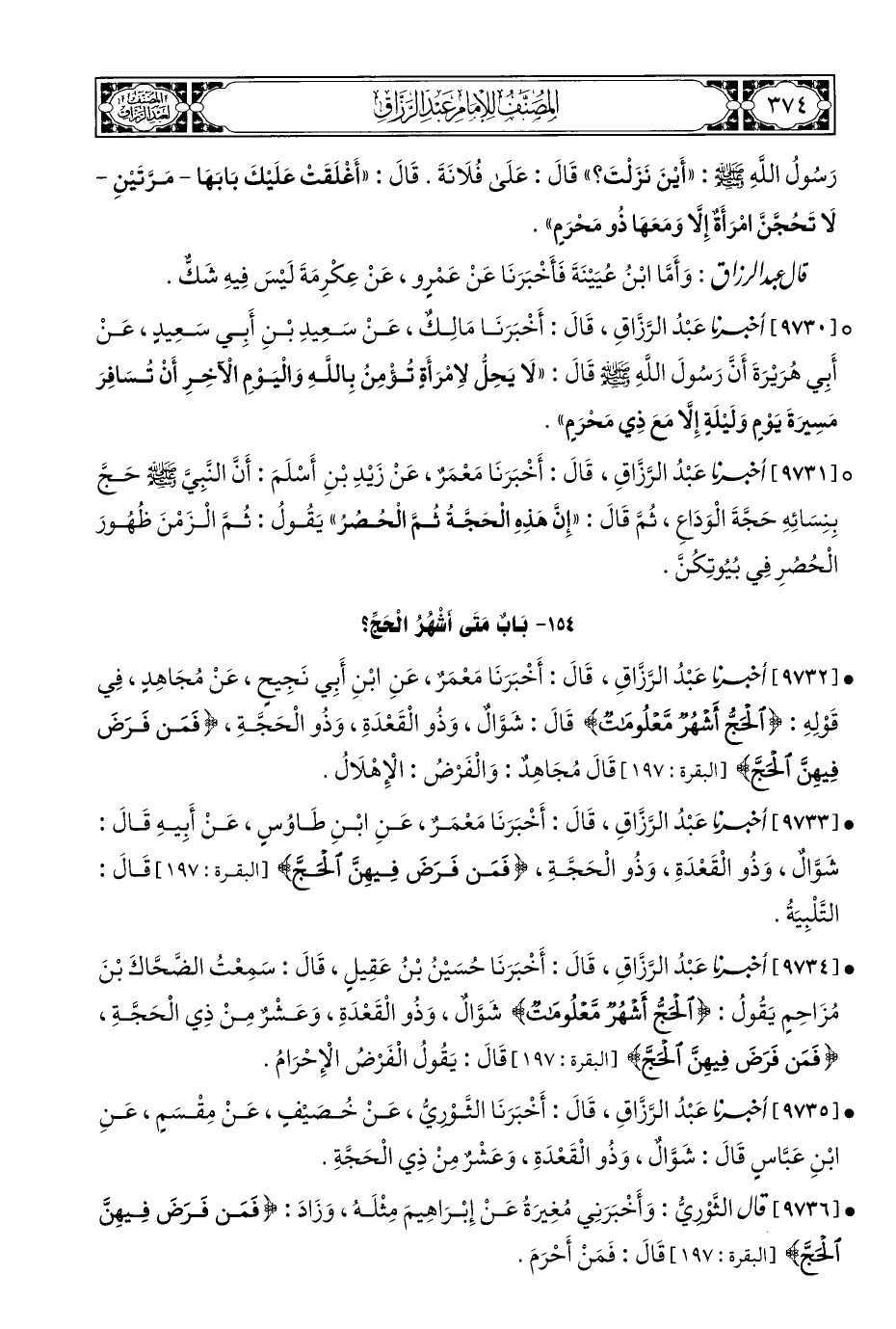 • [٩٧٣٢] أخبرنا عَبْدُ الرَّزَّاقِ، قَالَ: أَخْبَرَنَا مَعْمَرٌ، عَنِ ابْنِ أَبِي نَجِيحٍ، عَنْ مُجَاهِدٍ، فِي قَوْلِهِ: {الْحَجُّ أَشْهُرٌ مَعْلُومَاتٌ} قَالَ: شَوَّالٌ، وَذُو الْقَعْدَةِ، وَذُو الْحَجَّةِ، {فَمَنْ فَرَضَ فِيهِنَّ الْحَجَّ} [البقرة: ١٩٧] قَالَ مُجَاهِدٌ: وَالْفَرْضُ: الْإِهْلَالُ.