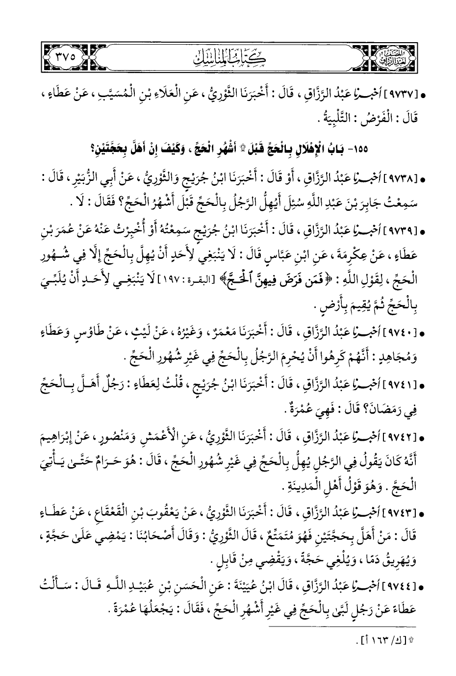 • [٩٧٤١] أخبرنا عَبْدُ الرَّزَّاقِ، قَالَ: أَخْبَرَنَا ابْنُ جُرَيْجٍ، قُلْتُ لِعَطَاءٍ: رَجُلٌ أَهَلَّ بِالْحَجِّ فِي رَمَضَانَ؟ قَالَ: فَهِيَ عُمْرَةٌ.