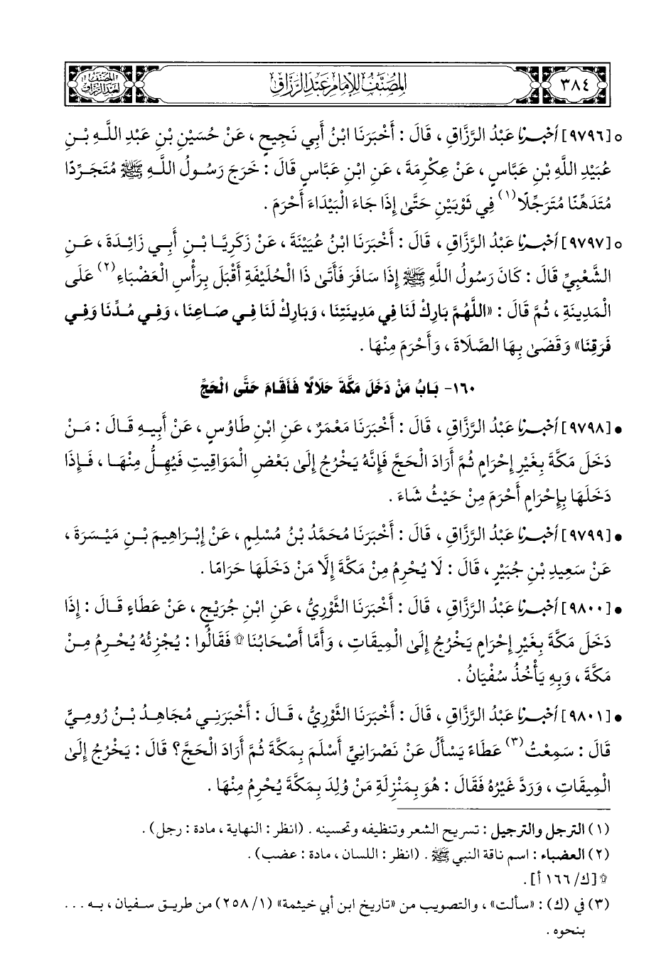 ° [٩٧٩٦] أخبرنا عَبْدُ الرَّزَّاقِ، قَالَ: أَخْبَرَنَا ابْنُ أَبِي نَجِيحٍ، عَنْ حُسَيْنِ بْنِ عَبْدِ اللهِ بْنِ عُبَيْدِ اللهِ بْنِ عَبَّاسٍ، عَنْ عِكْرِمَةَ، عَنِ ابْنِ عَبَّاسٍ قَالَ: خَرَجَ رَسُولُ اللهِ - صلى الله عليه وسلم - مُتَجَرِّدًا مُتَدَهِّنًا مُتَرَجِّلًا (¬١) فِي ثَوْبَيْنِ حَتَّى إِذَا جَاءَ الْبَيْدَاءَ أَحْرَمَ.
