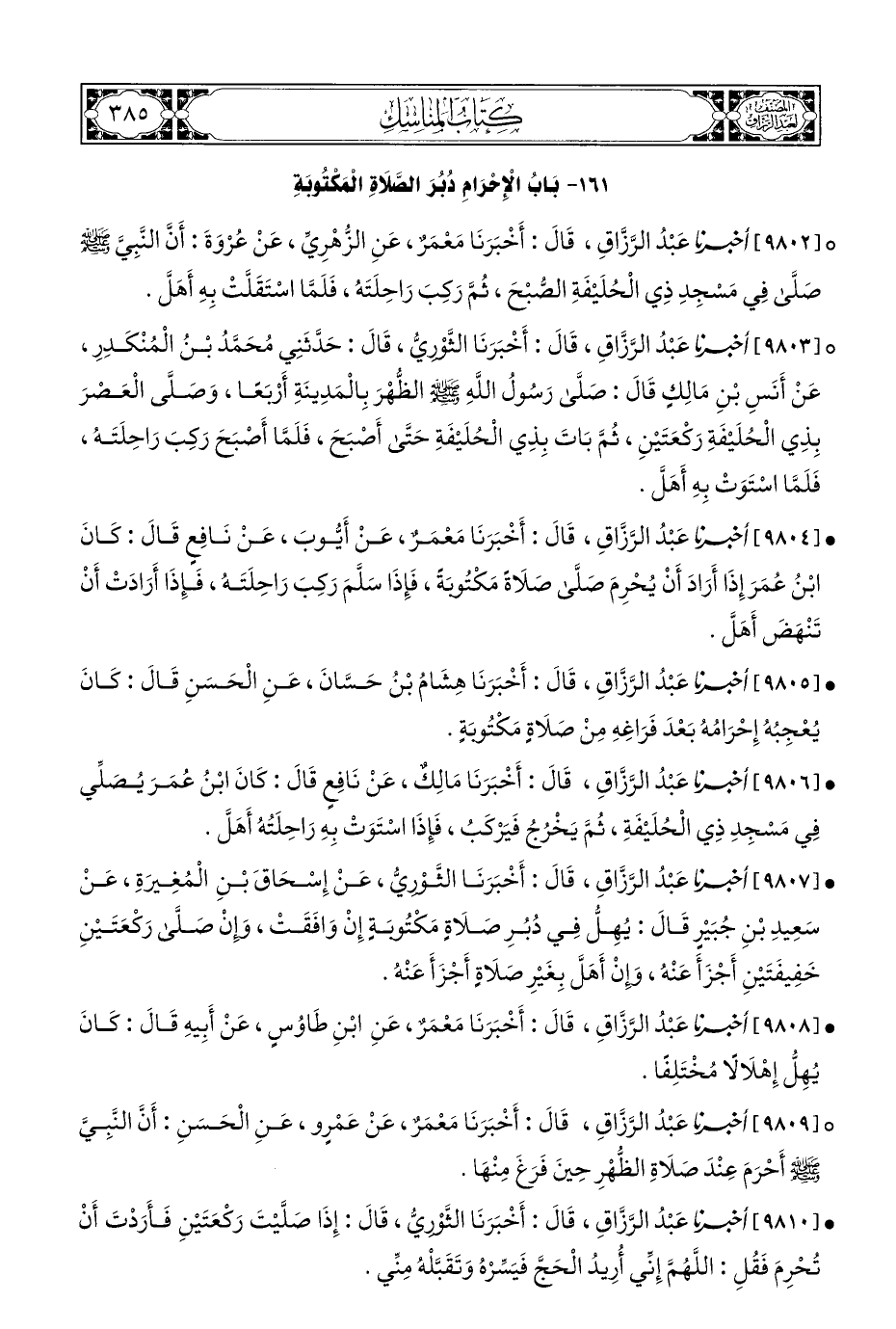 ° [٩٨٠٣] أخبرنا عَبْدُ الرَّزَّاقِ، قَالَ: أَخْبَرَنَا الثَّوْرِيُّ، قَالَ: حَدَّثَنِي مُحَمَّدُ بْنُ الْمُنْكَدِرِ، عَنْ أَنَسِ بْنِ مَالِكٍ قَالَ: صَلَّى رَسُولُ اللهِ - صلى الله عليه وسلم - الظُّهْرَ بِالْمَدِينَةِ أَرْبَعًا، وَصَلَّى الْعَصرَ بِذِي الْحُلَيْفَةِ رَكْعَتَيْنِ، ثُمَّ بَاتَ بِذِي الْحُلَيْفَةِ حَتَّى أَصبَحَ، فَلَمَّا أَصْبَحَ رَكِبَ رَاحِلَتَهُ، فَلَمَّا اسْتَوَتْ بِهِ أَهَلَّ.
