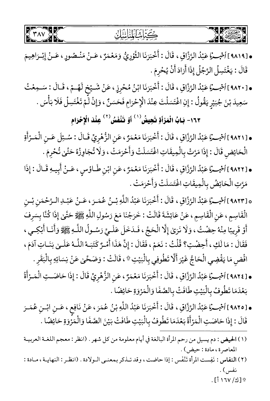 (¬٢) النفاس: نَفِست المرأة تَنْفَس: إذا حاضت، وقد تذكر بمعنى الولادة. (انظر: النهاية، مادة: نفس).