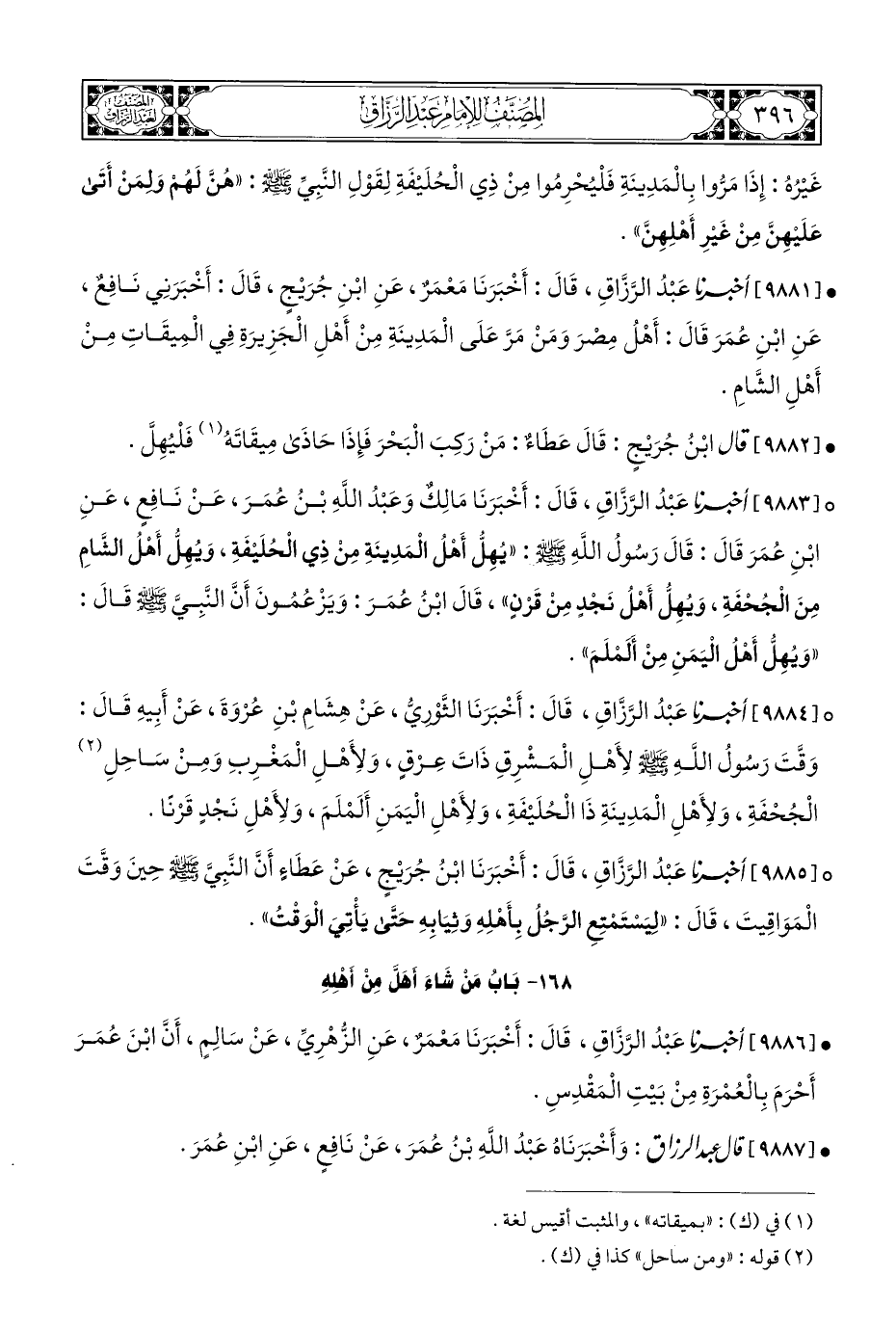 ° [٩٨٨٣] أخبرنا عَبْدُ الرَّزَّاقِ، قَالَ: أَخْبَرَنَا مَالِكٌ وَعَبْدُ اللهِ بْنُ عُمَرَ، عَنْ نَافِعٍ، عَنِ ابْنِ عُمَرَ قَالَ: قَالَ رَسُولُ اللهِ - صلى الله عليه وسلم -: "يُهِلُّ أَهْلُ الْمَدِينَةِ مِنْ ذِي الْحُلَيْفَةِ، وَيُهِلُّ أَهْلُ الشَّامِ مِنَ الْجُحْفَةِ، وَيُهِلُّ أَهْلُ نَجْدٍ مِنْ قَرْنٍ"، قَالَ ابْنُ عُمَرَ: وَيَزْعُمُونَ أَنَّ النَّبِيَّ - صلى الله عليه وسلم - قَالَ: "وَيُهِلُّ أَهْلُ الْيَمَنِ مِنْ ألَمْلَمَ".
