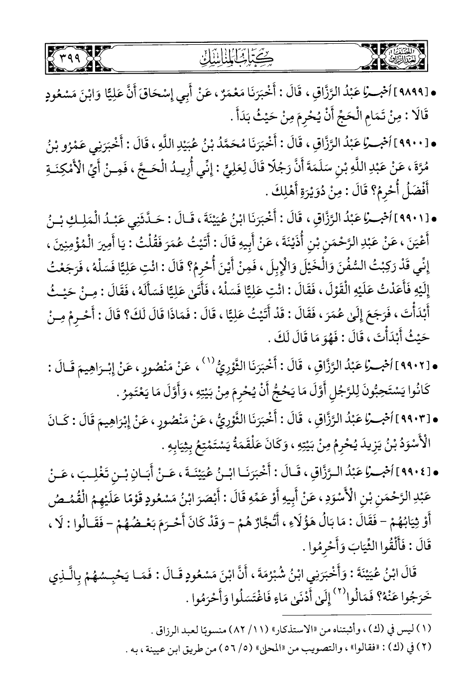 • [٩٩٠٤] أخبرنا عَبْدُ الرَّزَّاقِ، قَالَ: أَخْبَرَنَا ابْنُ عُيَيْنَةَ، عَنْ أَبَانِ بْنِ تَغْلِبَ، عَنْ عَبْدِ الرَّحْمَنِ بْنِ الْأَسْوَدِ، عَنْ أَبِيهِ أَوْ عَمِّهِ قَالَ: أَبْصَرَ ابْنُ مَسْعُودٍ قَوْمًا عَلَيْهِمُ الْقُمُصُ أَوْ ثِيَابُهُمْ - فَقَالَ: مَا بَالُ هَؤُلَاءِ، أَتُجَّارٌ هُمْ - وَقَدْ كَانَ أَحْرَمَ بَعْضُهُمْ - فَقَالُوا: لَا، قَالَ: فَأَلْقُوا الثِّيَابَ وَأَحْرِمُوا.