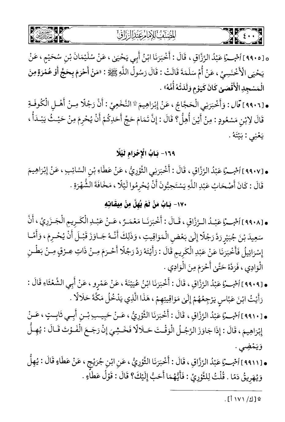 • [٩٩٠٨] أخبرنا عَبْدُ الرَّزَّاقِ، قَالَ: أَخْبَرَنَا مَعْمَرٌ، عَنْ عَبْدِ الْكَرِيمِ الْجَزَرِيِّ، أَنَّ سَعِيدَ بْنَ جُبَيْرٍ رَدَّ رَجُلًا إِلَى بَعْضِ الْمَوَاقِيتِ، وَذَلِكَ أَنَّهُ جَاوَزَ قَبْلَ أَنْ يُحْرِمَ، وَأَمَّا إِسْرَائِيلُ فَأَخْبَرَنَا عَنْ عَبْدِ الْكَرِيمِ قَالَ: رَأَيْتَهُ رَدَّ رَجُلًا أَحْرَمَ مِنْ ذَاتِ عِرْقٍ مِنْ بَطْنِ الْوَادِي، فَرَدَّهُ حَتَّى أَحْرَمَ مِنَ الْوَادِي.