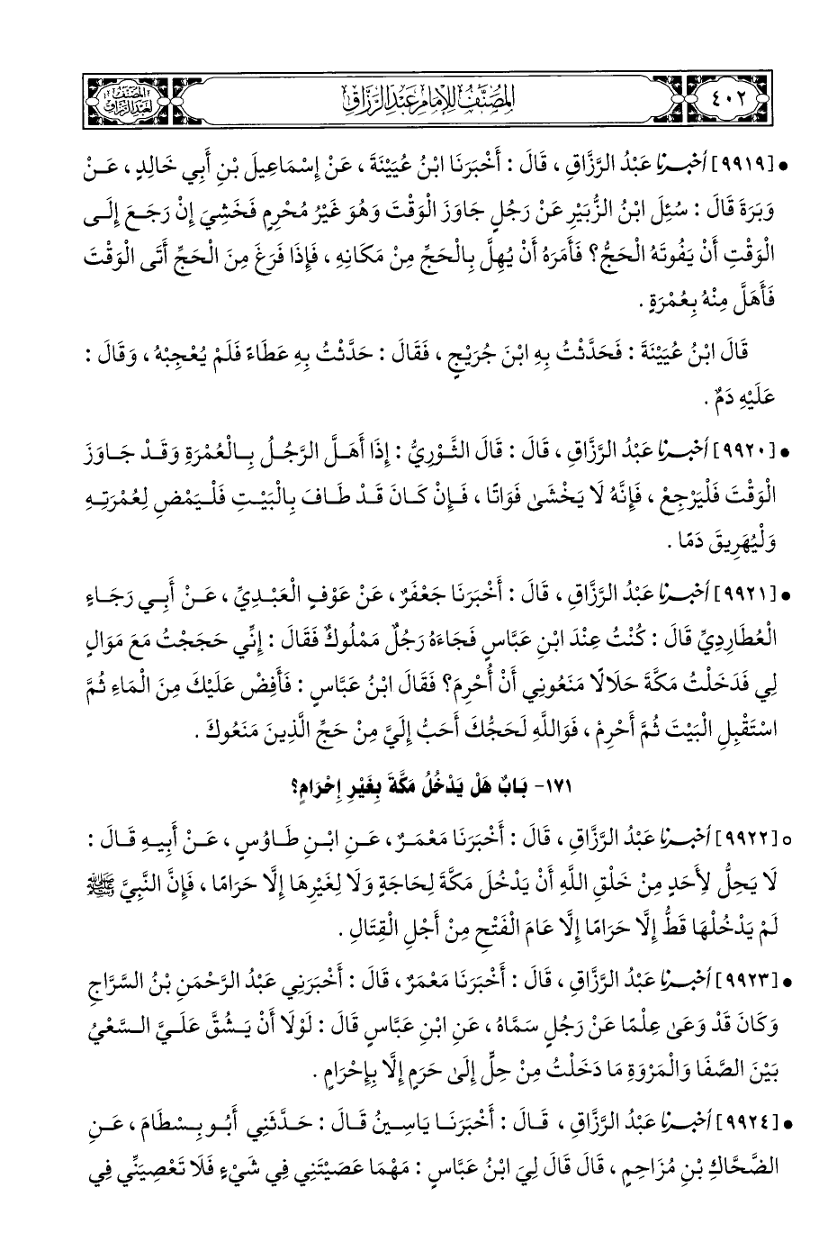 ° [٩٩٢٢] أَخْبَرَنَا عَبْدُ الرَّزَّاقِ، قَالَ: أَخْبَرَنَا مَعْمَرٌ، عَنِ ابْنِ طَاوُسٍ، عَنْ أَبِيهِ قَالَ: لَا يَحِلُّ لِأَحَدٍ مِنْ خَلْقِ اللَّهِ أَنْ يَدْخُلَ مَكَّةَ لِحَاجَةٍ وَلَا لِغَيْرِهَا إِلَّا حَرَامًا، فَإِنَّ النَّبِيَّ - صلى الله عليه وسلم - لَمْ يَدْخُلْهَا قَطُّ إِلَّا حَرَامًا إِلَّا عَامَ الْفَتْحِ مِنْ أَجْلِ الْقِتَالِ.