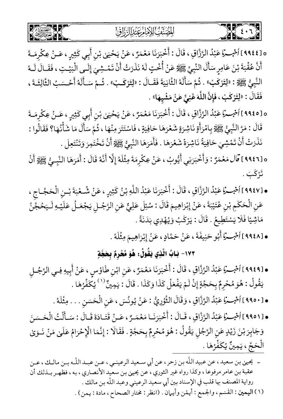 • [٩٩٤٩] أَخْبَرَنَا عَبْدُ الرَّزَّاقِ، قَالَ: أَخْبَرَنَا مَعْمَرٌ، عَنِ ابْنِ طَاوُسٍ، عَنْ أَبِيهِ فِي الرَّجُلِ يَقُولُ: هُوَ مُحْرِمٌ بِحَجَّةٍ إِنْ لَمْ يَفْعَلْ كَذَا وَكَذَا. قَالَ: يَمِينٌ (¬١) يُكَفِّرُهَا.