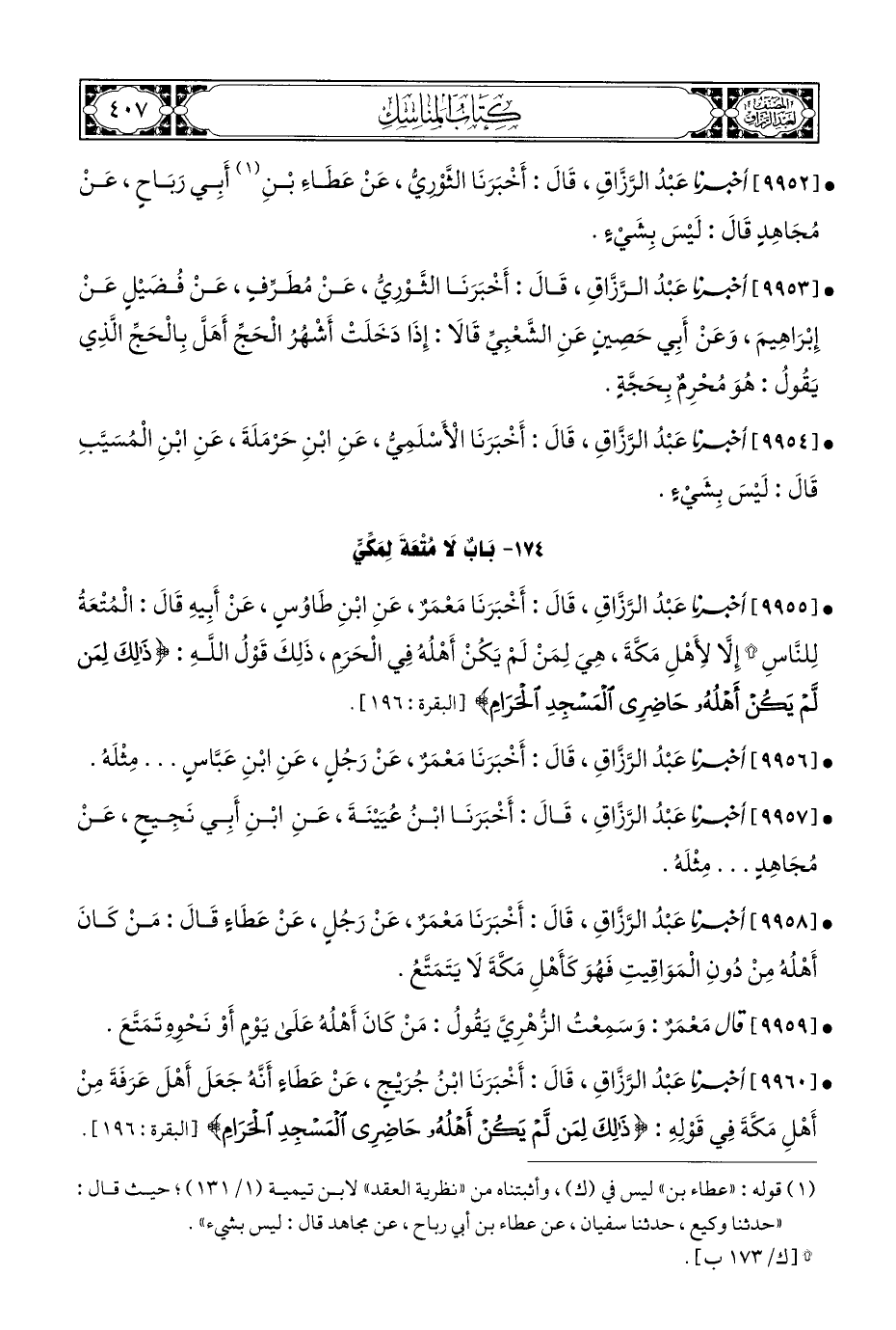 • [٩٩٥٥] أَخْبَرَنَا عَبْدُ الرَّزَّاقِ، قَالَ: أَخْبَرَنَا مَعْمَرٌ، عَنِ ابْنِ طَاوُسٍ، عَنْ أَبِيهِ قَالَ: الْمُتْعَةُ لِلنَّاسِ * إِلَّا لِأَهْلِ مَكَّةَ، هِيَ لِمَنْ لَمْ يَكُنْ أَهْلُهُ فِي الْحَرَمِ، ذَلِكَ قَوْلُ اللَّهِ: {ذَلِكَ لِمَنْ لَمْ يَكُنْ أَهْلُهُ حَاضِرِي الْمَسْجِدِ الْحَرَامِ} [البقرة: ١٩٦].