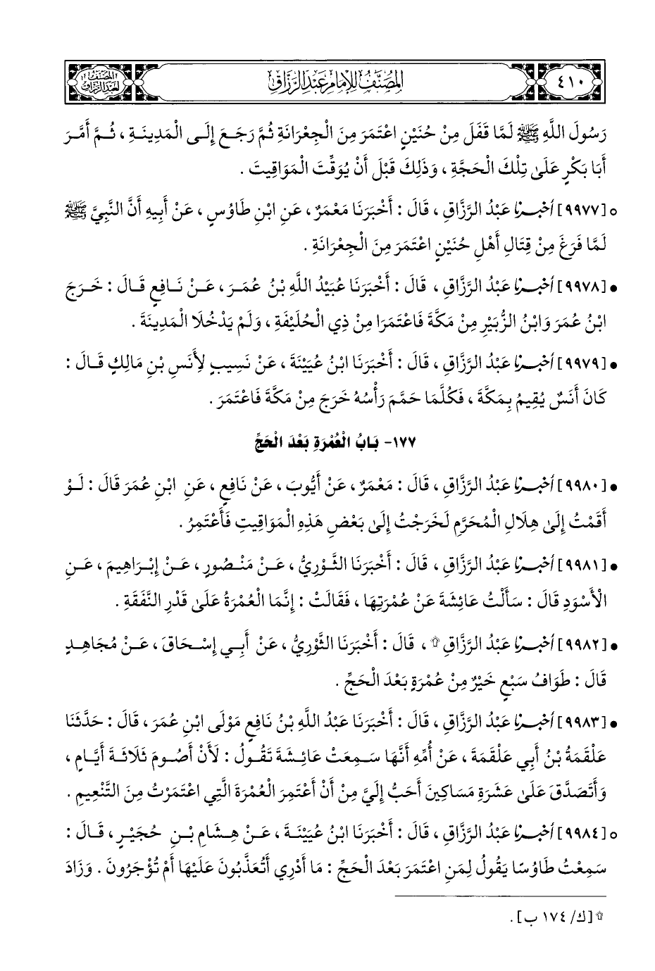 ° [٩٩٧٧] أَخْبَرَنَا عَبْدُ الرَّزَّاقِ، قَالَ: أَخْبَرَنَا مَعْمَرٌ، عَنِ ابْنِ طَاوُسٍ، عَنْ أَبِيهِ أَنَّ النَّبِيَّ - صلى الله عليه وسلم - لَمَّا فَرَغَ مِنْ قِتَالِ أَهْلِ حُنَيْنٍ اعْتَمَرَ مِنَ الْجِعْرَانَةِ.