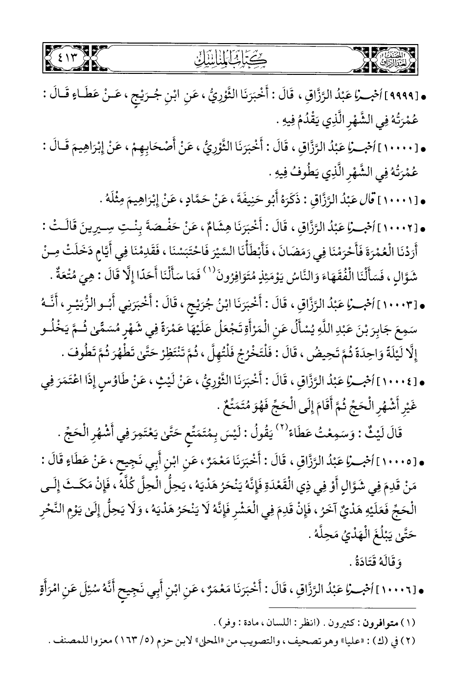 • [١٠٠٠٥] أَخْبَرَنَا عَبْدُ الرَّزَّاقِ، قَالَ: أَخْبَرَنَا مَعْمَرٌ، عَنِ ابْنِ أَبِي نَجِيحٍ، عَنْ عَطَاءٍ قَالَ: مَنْ قَدِمَ فِي شَوَّالٍ أَوْ فِي ذِي الْقَعْدَةِ فَإِنَّهُ يَنْحَرُ هَدْيَهُ، يَحِلُّ الْحِلَّ كُلَّهُ، فَإِنْ مَكَثَ إِلَى الْحَجِّ فَعَلَيْهِ هَدْيٌ آخَرُ، فَإِنْ قَدِمَ فِي الْعَشْرِ فَإِنَّهُ لَا يَنْحَرُ هَدْيَهُ، وَلَا يَحِلُّ إِلَى يَوْمِ النَّحْرِ حَتَّى يَبْلُغَ الْهَدْيُ مَحِلَّهُ.