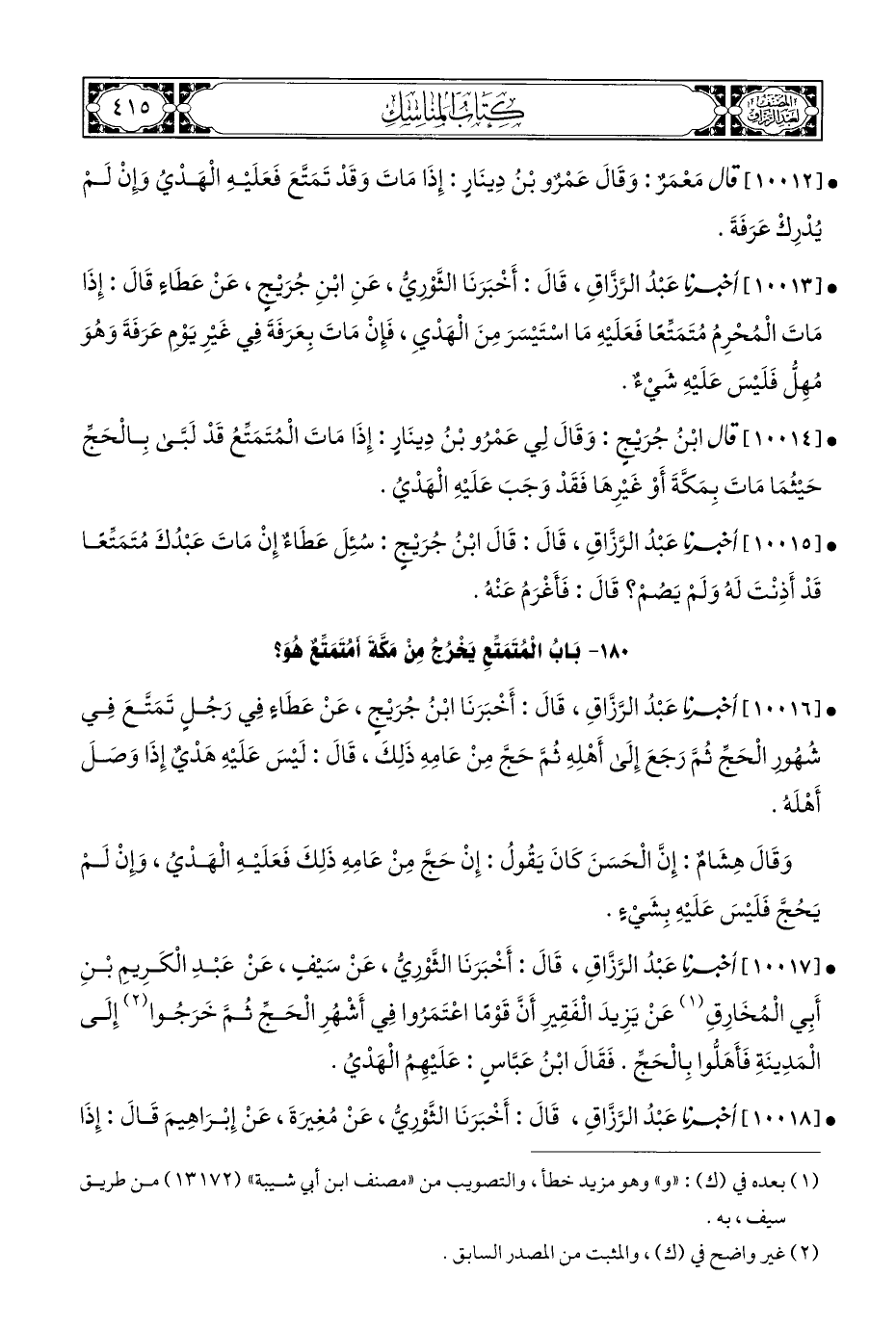 • [١٠٠١٧] أَخْبَرَنَا عَبْدُ الرَّزَّاقِ، قَالَ: أَخْبَرَنَا الثَّوْريُّ، عَنْ سَيْفٍ، عَنْ عَبْدِ الْكَرِيمِ بْنِ أَبِي الْمُخَارِقِ (¬١) عَنْ يَزِيدَ الْفَقِيرِ أَنَّ قَوْمًا اعْتَمَرُوا فِي أَشْهُرِ الْحَجِّ ثُمَّ خَرَجُوا (¬٢) إِلَى الْمَدِينَةِ فَأَهَلُّوا بِالْحَجِّ. فَقَالَ ابْنُ عَبَّاسٍ: عَلَيْهِمُ الْهَدْيُ.