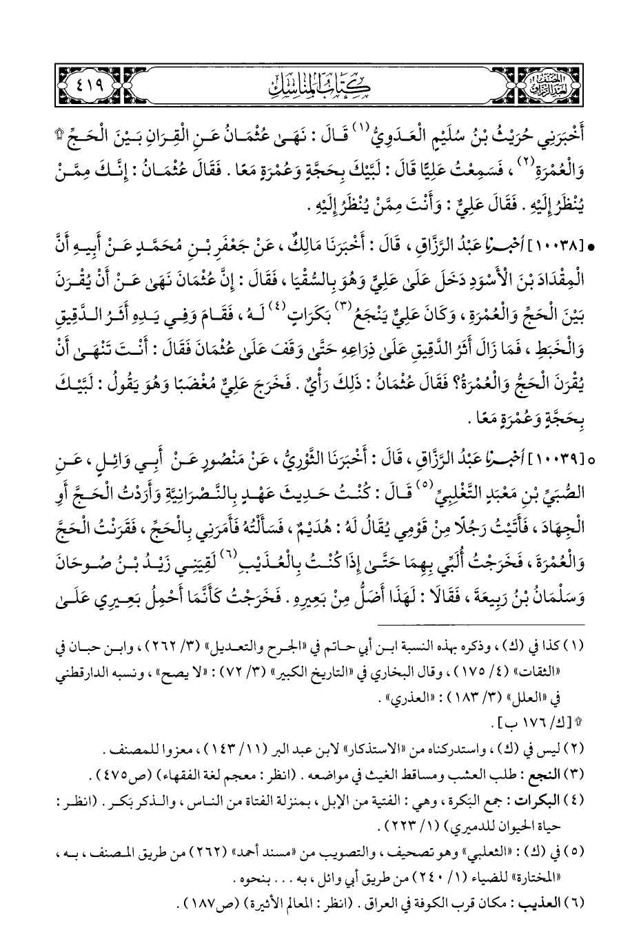 ° [١٠٠٣٩] أَخْبَرَنَا عَبْدُ الرَّزَّاقِ، قَالَ: أَخْبَرَنَا الثُّوْرِيُّ، عَنْ مَنْصُورٍ عَنْ أَبِي وَائِلٍ، عَنِ الصُّبَيِّ بْنِ مَعْبَدٍ التَّغْلِبِيِّ (¬٥) قَالَ: كُنْتُ حَدِيثَ عَهْدٍ بِالنَّصْرَانِيَّةِ وَأَرَدْتُ الْحَجَّ أَوِ الْجِهَادَ، فَأَتَيْتُ رَجُلًا مِنْ قَوْمِي يُقَالُ لَهُ: هُدَيْمٌ، فَسَأَلْتُهُ فَأَمَرَنِي بِالْحَجِّ، فَقَرَنْتُ الْحَجَّ وَالْعُمْرَةَ، فَخَرَجْتُ أُلَبِّي بِهِمَا حَتَّى إِذَا كُنْتُ بِالْعُذَيْبِ (¬٦) لَقِيَنِي زَيْدُ بْنُ صُوحَانَ وَسَلْمَانُ بْنُ رَبِيعَةَ، فَقَالَا: لَهَذَا أَضلُّ مِنْ بَعِيرِهِ. فَخَرَجْتُ كَأَنَّمَا أَحْمِلُ بَعِيرِي عَلَى