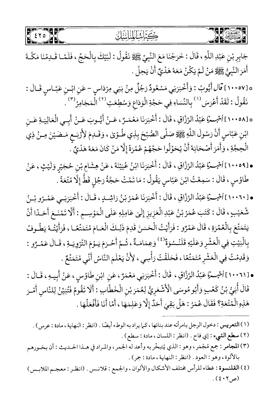 • [١٠٠٦٠] أَخْبَرَنَا عَبْدُ الرَّزَّاقِ، قَالَ: أَخْبَرَنَا عُمَرُ بْنُ رَاشِدٍ، قَالَ: أَخْبَرَنِي عَمْرُو بْنُ شُعَيْبٍ، قَالَ: كَتَبَ عُمَرُ بْنُ عَبْدِ الْعَزِيزِ إِلَى عَامِلِهِ عَلَى الْمَوْسِمِ: أَلَّا تَمْنَعَ أَحَدًا أَنْ يَتَمَتَّعَ بِالْعُمْرَةِ، قَالَ عَمْرٌو: فَرَأَيْتُ الْحَسَنَ قَدِمَ ذَلِكَ الْعَامَ مُتَمَتِّعًا، فَرَأَيْتُهُ يَطُوفُ بِالْبَيْتِ فِي الْعَشْرِ وَعَلَيْهِ قَلَنْسُوَةٌ (¬٤) وَعِمَامَةٌ، ثُمَّ أَحْرَمَ يَوْمَ التَّرْوِيَةِ، قَالَ عَمْرٌو: وَقَدِمْتُ فِي الْعَشْرِ مُتَمَتِّعًا، فَحَلَقْتُ رَأْسِي، لِأَنْ يَعْلَمَ النَّاسُ أَنِّي مُتَمَتِّعٌ.