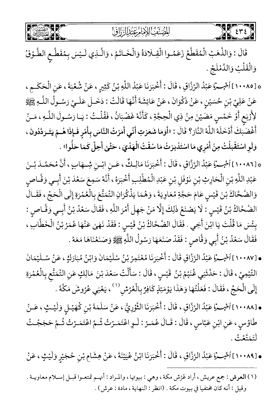 • [١٠٠٨٧] أَخْبَرَنَا عَبْدُ الرَّزَّاقِ قَالَ: أَخْبَرَنَا مُعْتَمِرُ بْنُ سُلَيْمَانَ وَابْنُ مُبَارَكٍ، عَنْ سُلَيْمَانَ التَّيْمِيِّ، قَالَ: حَدَّثَنِي غُنَيْمُ بْنُ قَيْسٍ، قَالَ: سَأَلْتُ سَعْدَ بْنَ مَالِكٍ عَنِ التَّمَتُّعِ بِالْعُمْرَةِ إِلَى الْحَجِّ، فَقَالَ: فَعَلْتُهَا وَهَذَا يَوْمَئِذٍ كَافِرٌ بِالْعُرُشِ (¬١)، يَعْنِي عُرُوشَ مَكَّةَ.