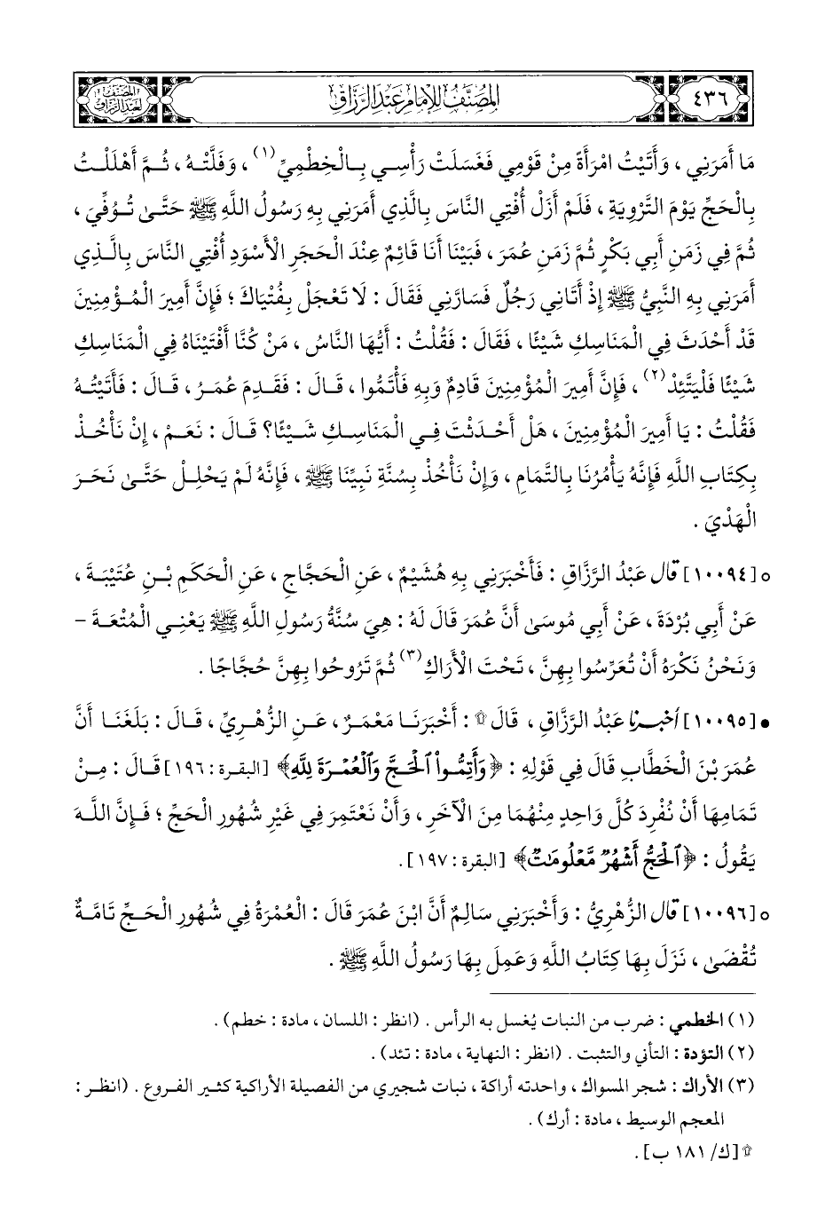 ° [١٠٠٩٤] قال عَبْدُ الرَّزَّاقِ: فَأَخْبَرَنِي بِهِ هُشَيْمٌ، عَنِ الْحَجَّاجِ، عَنِ الْحَكَمِ بْنِ عُتَيْبَةَ، عَنْ أَبِي بُرْدَةَ، عَن أَبِي مُوسَى أَنَّ عُمَرَ قَالَ لَهُ: هِيَ سُنَّةُ رَسُولِ اللَّهِ - صلى الله عليه وسلم - يَعْنِي الْمُتْعَةَ - وَنَحْنُ نَكْرَهُ أَنْ تُعَرِّسُوا بِهِنَّ، تَحْتَ الْأَرَاكِ (¬٣) ثُمَّ تَرُوحُوا بِهِنَّ حُجَّاجًا.