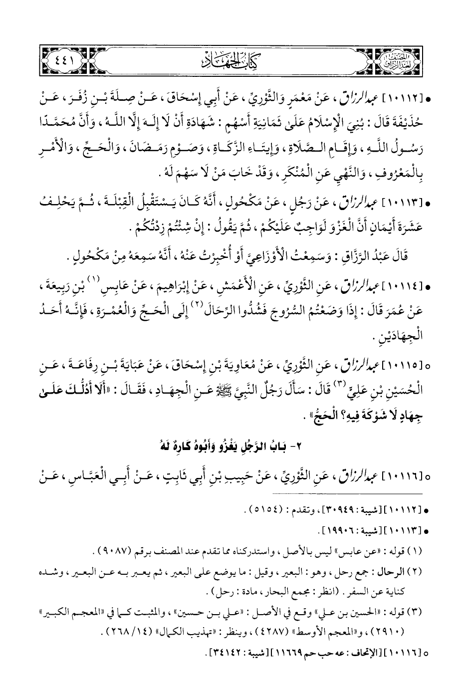 ° [١٠١١٥] عبد الرزاق، عَنِ الثَّوْرِيِّ، عَنْ مُعَاوِيَةَ بْنِ إِسْحَاقَ، عَنْ عَبَايَةَ بْنِ رِفَاعَةَ، عَنِ الْحُسَيْنِ بْنِ عَلِيٍّ (¬٣) قَالَ: سَأَلَ رَجُلٌ النَّبِيَّ - صلى الله عليه وسلم - عَنِ الْجِهَادِ، فَقَالَ: "أَلَا أَدُلُّكَ عَلَى جِهَادٍ لَا شَوْكَةَ فِيهِ؟ الْحَجُّ".