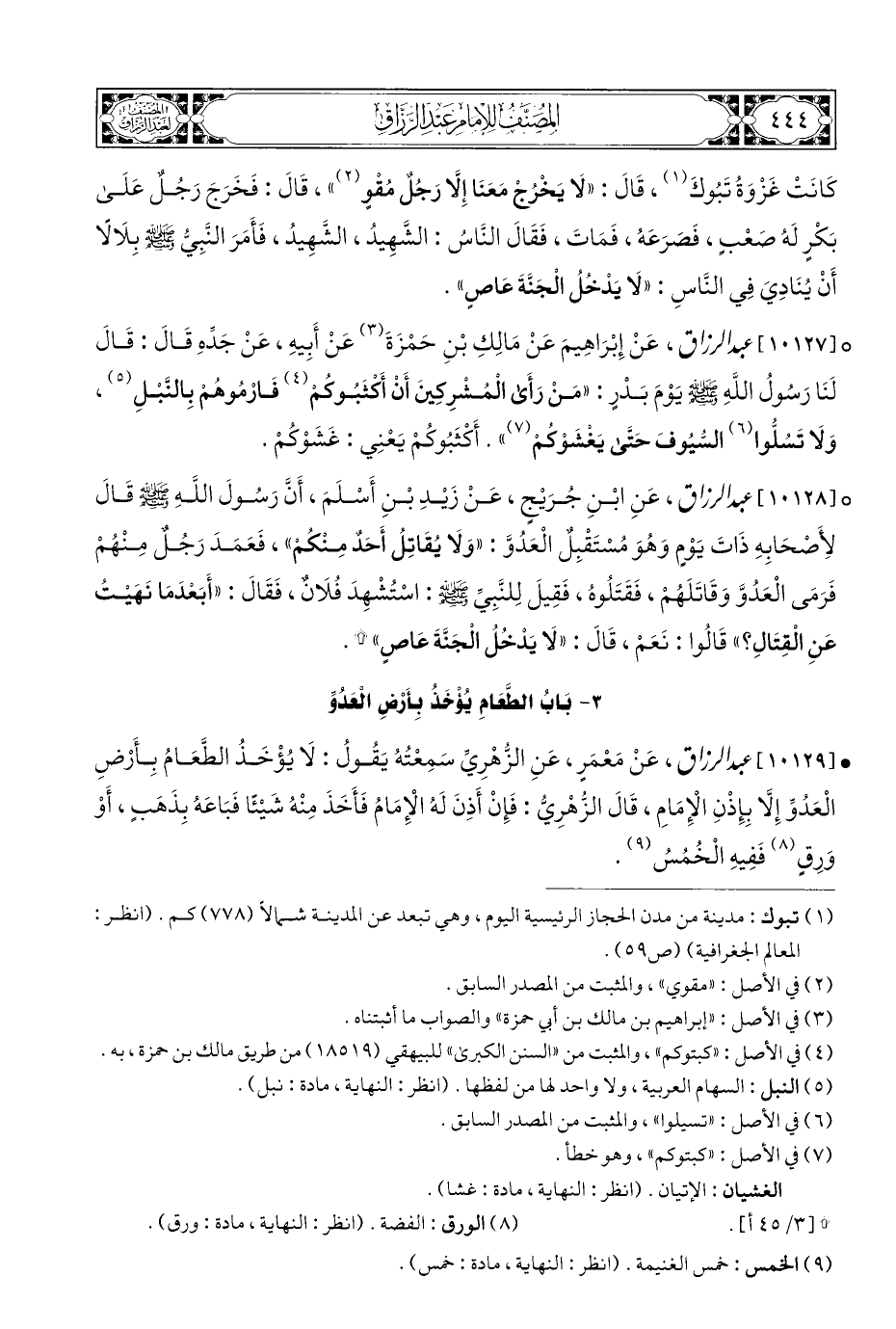• [١٠١٢٩] عبد الرزاق، عَنْ مَعْمَرٍ، عَنِ الزُّهْرِيِّ سَمِعْتُهُ يَتُولُ: لَا يُؤْخَذُ الطَّعَامُ بِأَرْضِ الْعَدُوِّ إِلَّا بِإِذْنِ الْإِمَامِ، قَالَ الزُّهْرِيُّ: فَإِنْ أَذِنَ لَهُ الْإِمَامُ فَأَخَذَ مِنْهُ شَيْئًا فَبَاعَهُ بِذَهَبٍ، أَوْ وَرِقٍ (¬٨) فَفِيهِ الْخُمُسُ (¬٩).