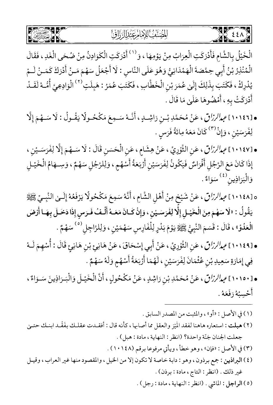 • [١٠١٤٦] عبد الرزاق، عَنْ مُحَمَّدِ بْنِ رَاشِدٍ، أَنَّهُ سَمِعَ مَكْحُولًا يَقُولُ: لَا سَهْمَ إِلَّا لِفَرَسَيْنِ، وإِنْ (¬٣) كَانَ مَعَهُ مِائَةُ فَرَسٍ.