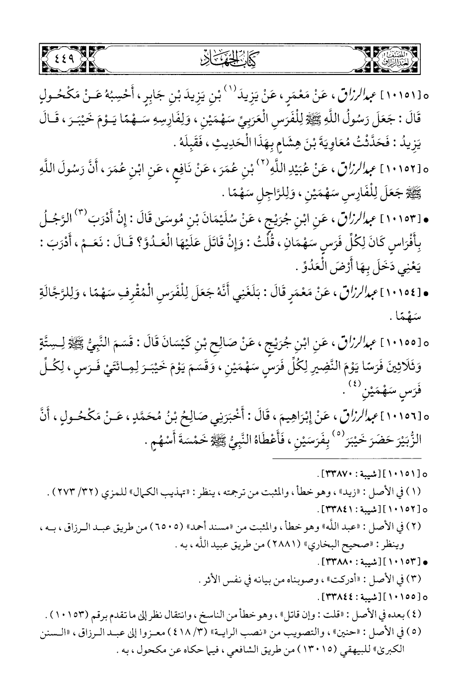 ° [١٠١٥٥] عبد الرزاق، عَنِ ابْنِ جُرَيْجٍ، عَنْ صالِحِ بْنِ كَيْسَانَ قَالَ: قَسَمَ النَّبِيُّ - صلى الله عليه وسلم - لِسِتَّةٍ وَثَلَاثِينَ فَرَسًا يَوْمَ النَّضِيرِ لِكُلِّ فَرَسٍ سَهْمَينِ، وَقَسَمَ يَوْمَ خَيْبَرَ لِمِائَتَي فَرَسٍ، لِكُلِّ فَرَسٍ سَهْمَيْنِ (¬٤).
