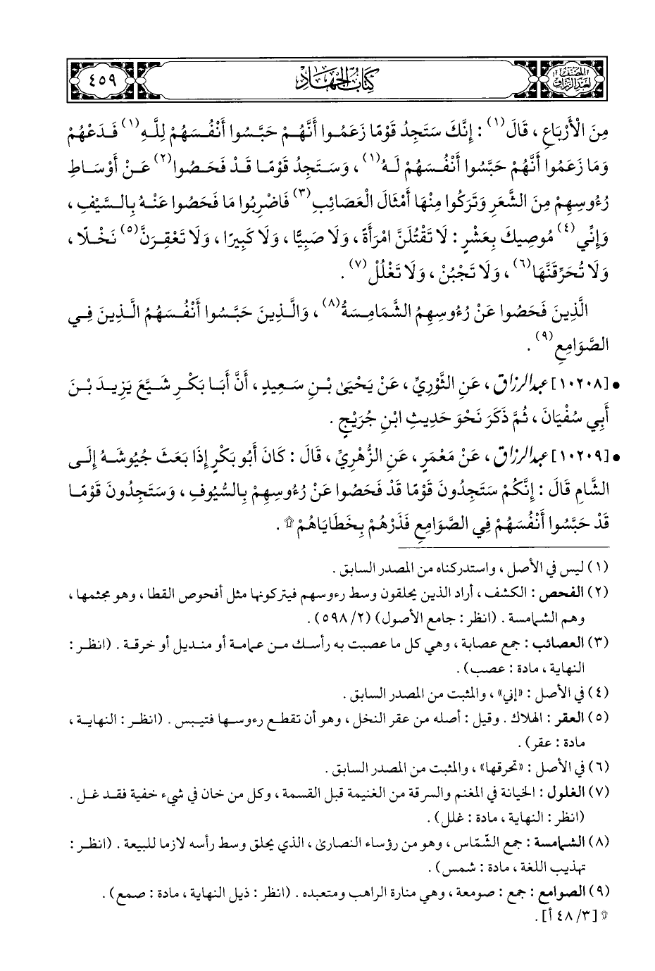 • [١٠٢٠٩] عبد الرزاق، عَنْ مَعْمَرٍ، عَنِ الزُّهْرِيِّ، قَالَ: كَانَ أَبُو بَكْرٍ إِذَا بَعَثَ جُيُوشهُ إِلَى الشَّامِ قَالَ: إِنَّكُمْ سَتَجِدُونَ قَوْمَا قَدْ فَحَصوا عَنْ رُءُوسِهِمْ بِالسُّيُوفِ، وَسَتَجِدُونَ قَوْمًا قَدْ حَبَّسُوا أَنْفُسَهُمْ فِي الصَّوَامِعِ فَذَرْهُمْ بِخَطَايَاهُمْ *.