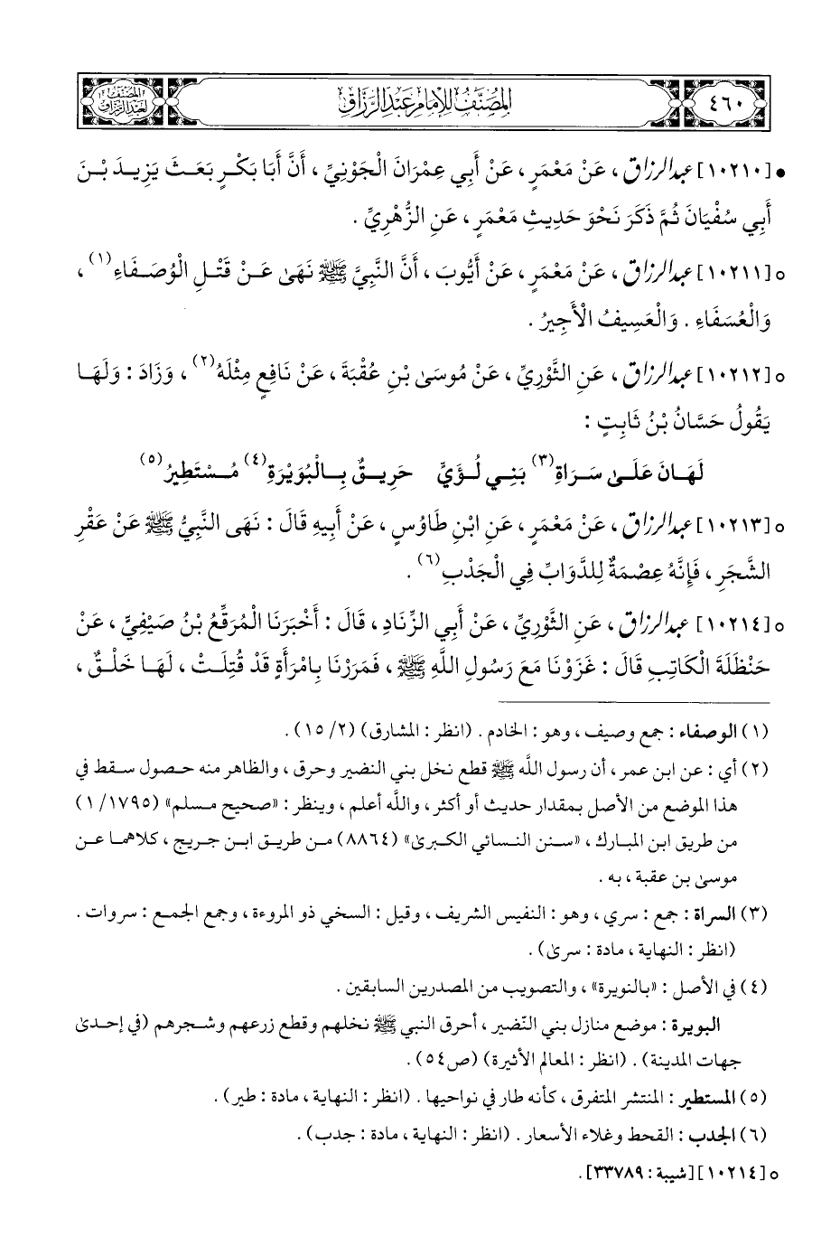 ° [١٠٢١٢] عبد الرزاق، عَنِ الثَّوْرِيِّ، عَنْ مُوسَى بْنِ عُقْبَةَ، عَنْ نَافِعٍ مِثْلَهُ (¬٢)، وَزَادَ: وَلَهَا يَقُولُ حَسَّانُ بْنُ ثَابِتٍ: