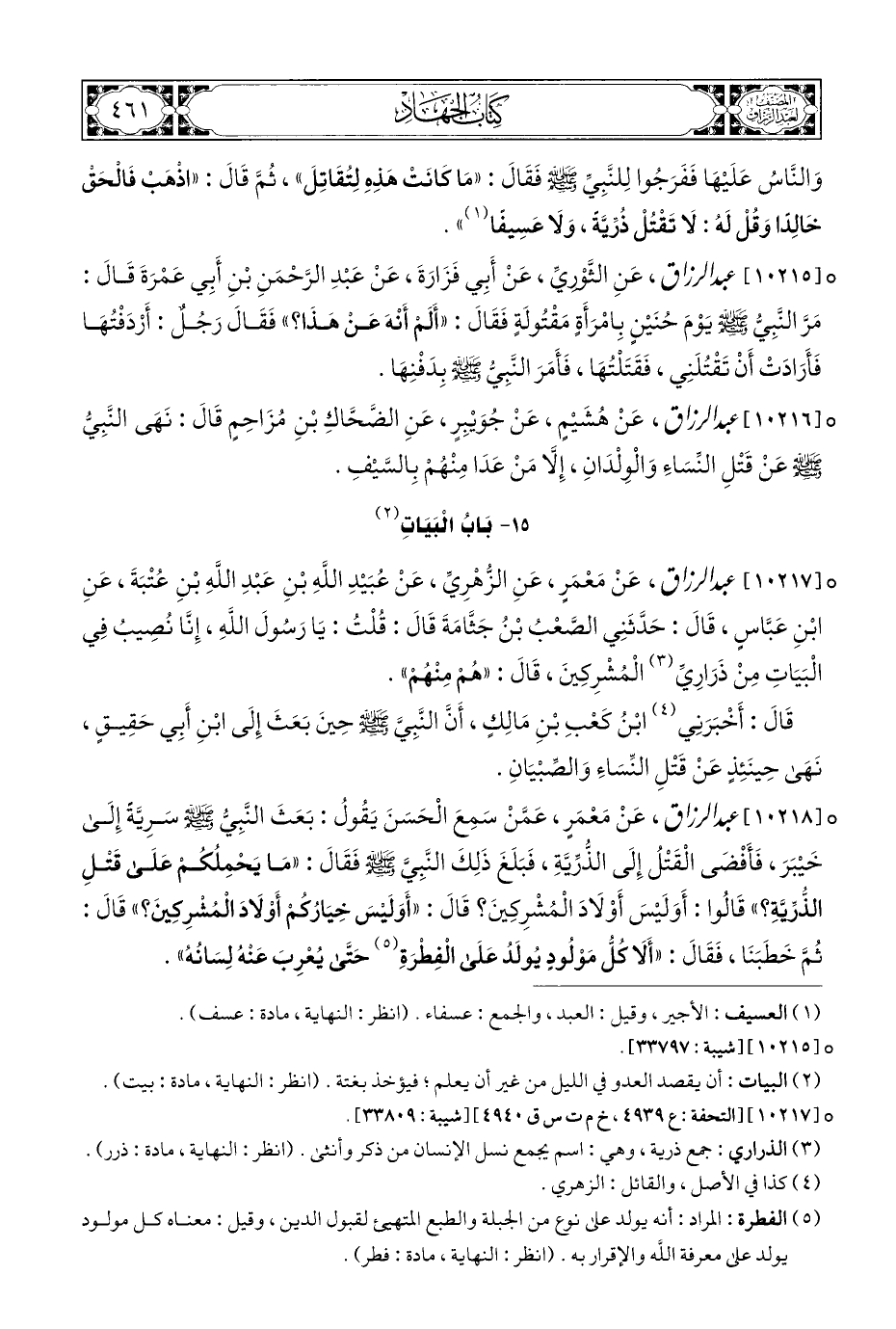 ° [١٠٢١٦] عبد الرزاق، عَنْ هُشَيْمٍ، عَنْ جُوَيْبِرٍ، عَنِ الضَّحَّاكِ بْنِ مُزَاحِمٍ قَالَ: نَهَى النَّبِيُّ - صلى الله عليه وسلم - عَنْ قَتْلِ النسَاءِ وَالْوِلْدَانِ، إِلَّا مَنْ عَدَا مِنْهُمْ بِالسَّيْفِ.