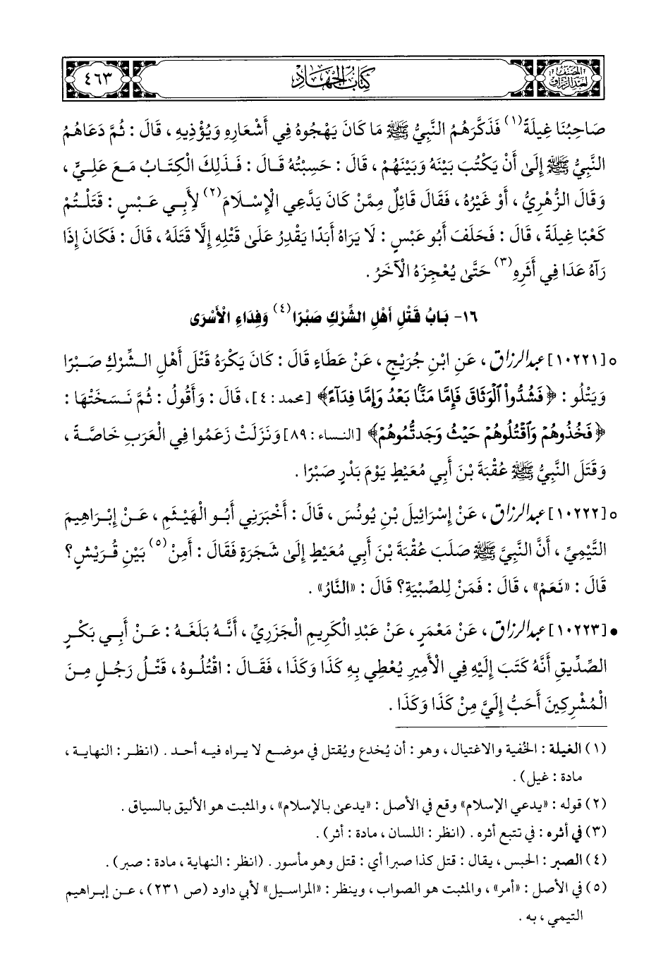 ° [١٠٢٢١] عبد الرزاق، عَنِ ابْنِ جُرَيْجٍ، عَنْ عَطَاءٍ قَالَ: كَانَ يَكْرَهُ قَتْلَ أَهْلِ الشِّرْكِ صبْرًا وَيَتْلُو: {فَشُدُّوا الْوَثَاقَ فَإِمَّا مَنًّا بَعْدُ وَإِمَّا فِدَاءً} [محمد: ٤]، قَالَ: وَأَقُولُ: ثُمَّ نَسَخَتْهَا: {فَخُذُوهُمْ وَاقْتُلُوهُمْ حَيْثُ وَجَدْتُمُوهُمْ} [النساء: ٨٩] وَنَزَلَتْ زَعَمُوا فِي الْعَرَبِ خَاصَّةً، وَقَتَلَ النَّبِيُّ - صلى الله عليه وسلم - عُقْبَةَ بْنَ أَبِي مُعَيْطٍ يَوْمَ بَدْرٍ صَبْرًا.