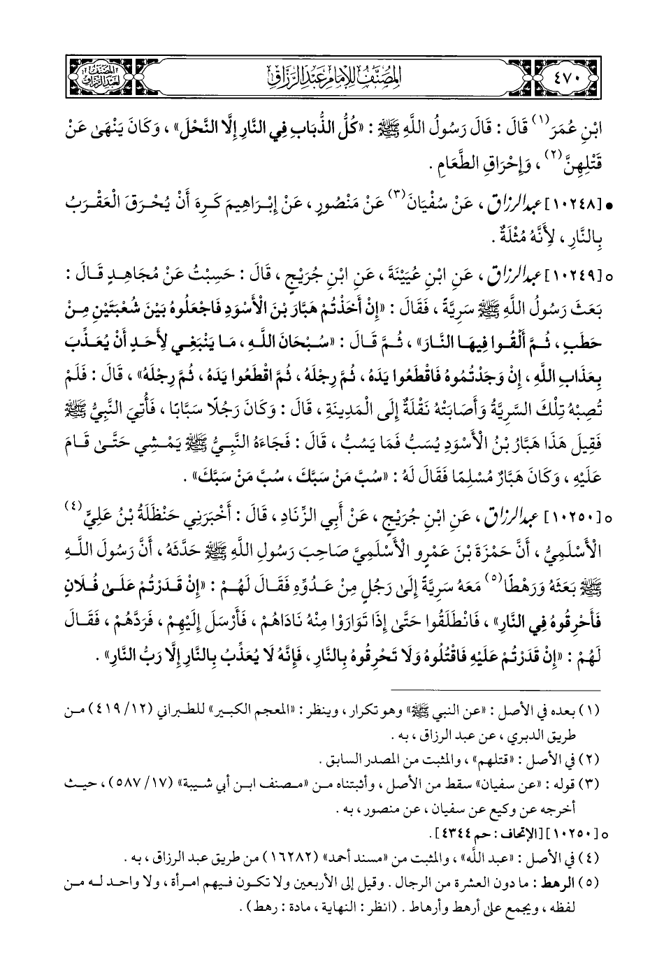 ° [١٠٢٤٩] عبد الرزاق، عَنِ ابْنِ عُيَيْنَةَ، عَنِ ابْنِ جُرَيْجٍ، قَالَ: حَسِبْتُ عَنْ مُجَاهِدٍ قَالَ: بَعَثَ رَسُولُ اللَّهِ - صلى الله عليه وسلم - سَرِيَّةً، فَقَالَ: "إِنْ أَخَذتُمْ هَبَّارَ بْنَ الْأَسْوَدِ فَاجْعَلُوهُ بَيْنَ شُعْبتَيْنِ مِنْ حَطَبٍ، ثُمَّ ألقُوا فِيهَا النَّارَ"، ثُمَّ قَالَ: "سُبْحَانَ اللَّهِ، مَا يَنْبَغِي لِأَحَدٍ أَنْ يُعَذِّبَ بِعَذَابِ اللَّهِ، إِنْ وَجَدْتُمُوهُ فَاقْطَعُوا يَدَهُ، ثُمَّ رِجْلَهُ، ثُمَّ اقْطَعُوا يَدَهُ، ثُمَّ رِجْلَهُ"، قَالَ: فَلَمْ تُصِبْهُ تِلْكَ السَّرِيَّةُ وَأَصَابَتْهُ نَقْلَةٌ إِلَى الْمَدِينَةِ، قَالَ: وَكَانَ رَجُلًا سَبَّابًا، فَأُتيَ النَّبِيُّ - صلى الله عليه وسلم - فَقِيلَ هَذَا هَبَّارُ بْنُ الْأَسْوَدِ يُسَبُّ فَمَا يَسُبُّ، قَالَ: فَجَاءَهُ النَّبِيُّ - صلى الله عليه وسلم - يمْشِي حَتَّى قَامَ عَلَيْهِ، وَكَانَ هَبَّارٌ مُسْلِمًا فَقَالَ لَهُ: "يسُبَّ مَنْ سَبَّكَ، يسُبَّ مَنْ سَبَّكَ".