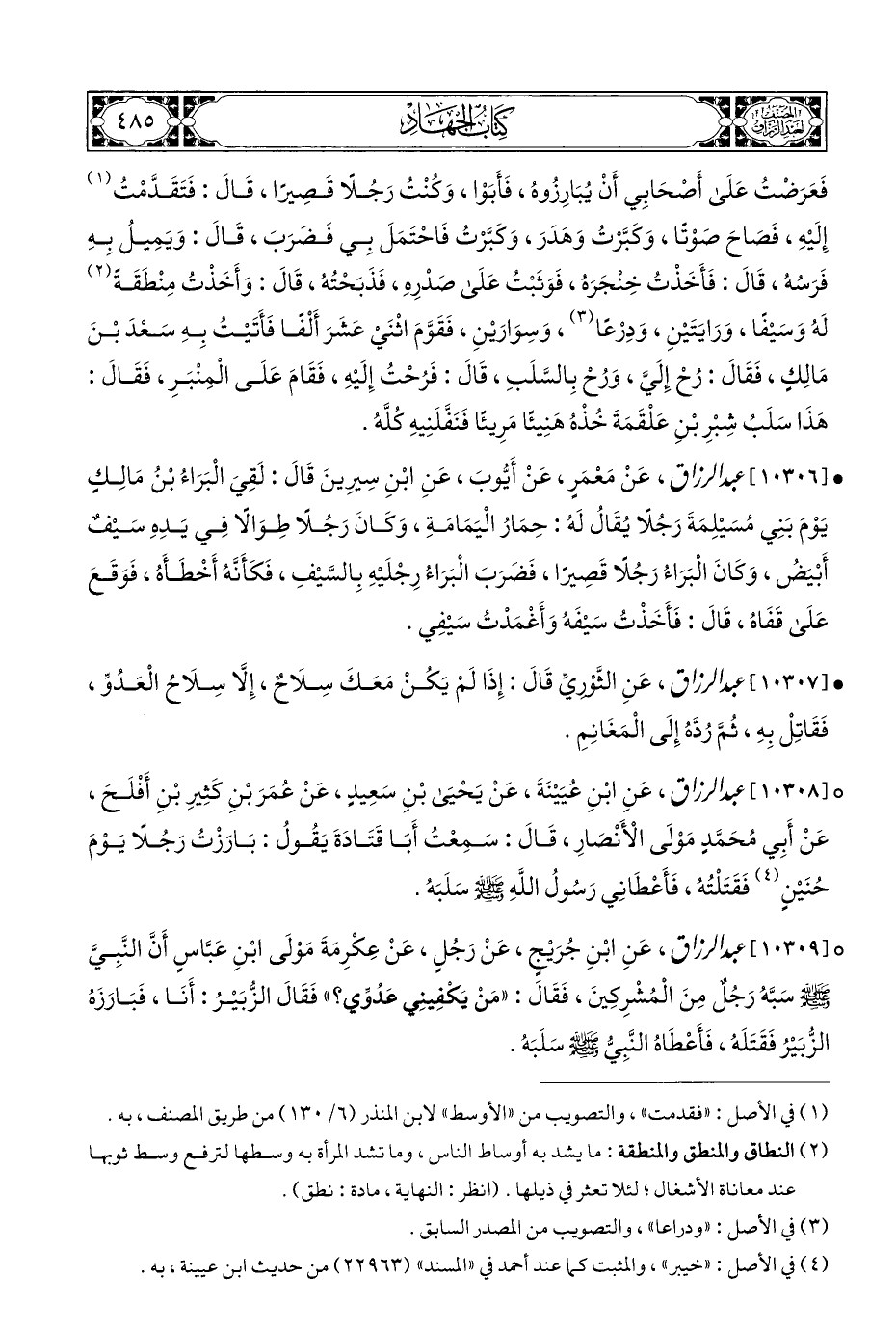 ° [١٠٣٠٨] عبد الرزاق، عَنِ ابْنِ عُيَيْنَةَ، عَنْ يَحْيَى بْنِ سَعِيدٍ، عَنْ عُمَرَ بْنِ كَثِيرِ بْنِ أَفْلَحَ، عَنْ أَبِي مُحَمَّدٍ مَوْلَى الْأَنْصَارِ، قَالَ: سَمِعْتُ أَبَا قَتَادَةَ يَقُولُ: بَارَزْتُ رَجُلًا يَوْمَ حُنَيْنٍ (¬٤) فَقَتَلْتُهُ، فَأَعْطَانِي رَسُولُ اللَّهِ - صلى الله عليه وسلم - سَلَبَهُ.
