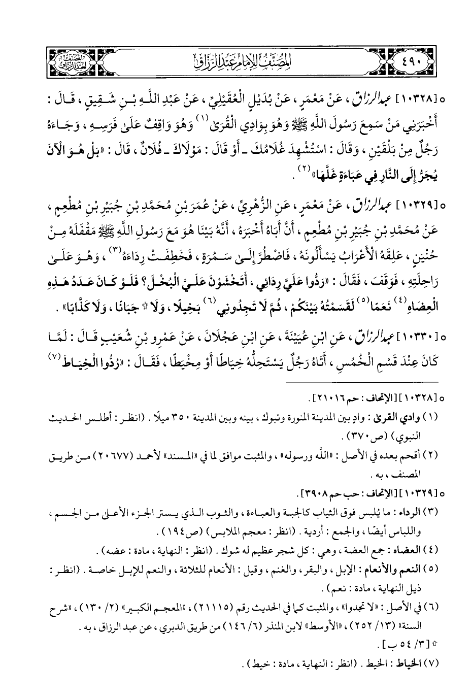 ° [١٠٣٢٨] عبد الرزاق، عَنْ مَعْمَرٍ، عَنْ بُدَيْلٍ الْعُقَيْلِيِّ، عَنْ عَبْدِ اللَّهِ بْنِ شَقِيقٍ، قَالَ: أَخْبَرَنِي منْ سَمِعَ رَسُولَ اللَّهِ - صلى الله عليه وسلم - وَهُوَ بِوَادِي الْقُرَى (¬١) وَهُوَ وَاقِفٌ عَلَى فَرَسِهِ، وَجَاءَهُ رَجُلٌ مِنْ بَلْقَيْنِ، وَقَالَ: اسْتُشْهِدَ غُلَامُكَ - أَوْ قَالَ: مَوْلَاكَ - فُلَانٌ، قَالَ: "بَلْ هُوَ الآنَ يُجَرُّ إِلَى النَّارِ فِي عَبَاءَةِ غَلَّهَا" (¬٢).