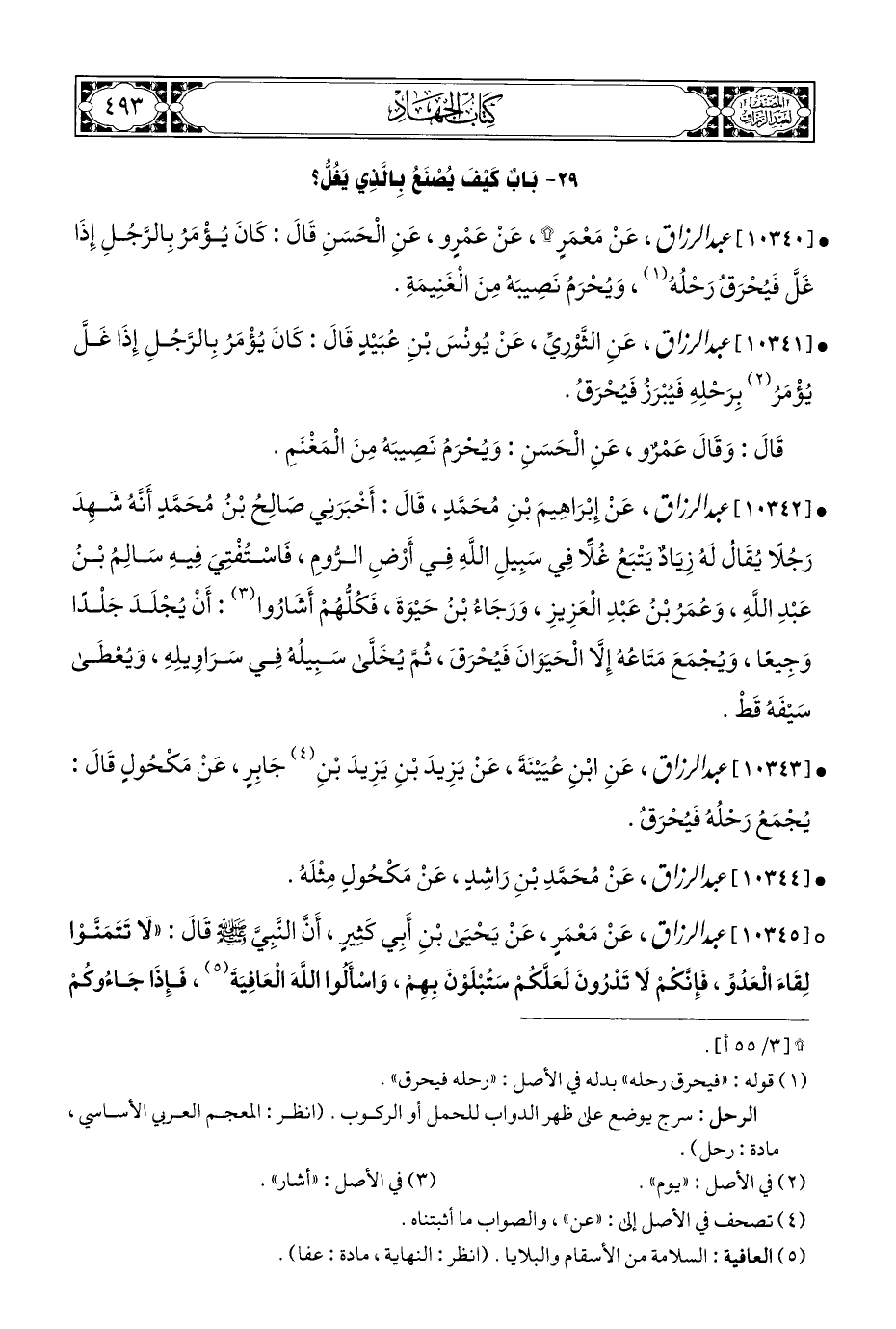 • [١٠٣٤١] عبد الرزاق، عَنِ الثَّوْريِّ، عَنْ يُونُسَ بْنِ عُبَيْدٍ قَالَ: كَانَ يُؤْمَرُ بِالرَّجُلِ إِذَا غَلَّ يُؤمَرُ (¬٢) بِرَحلِهِ فَيُبْرَزُ ويُحرَقُ.
