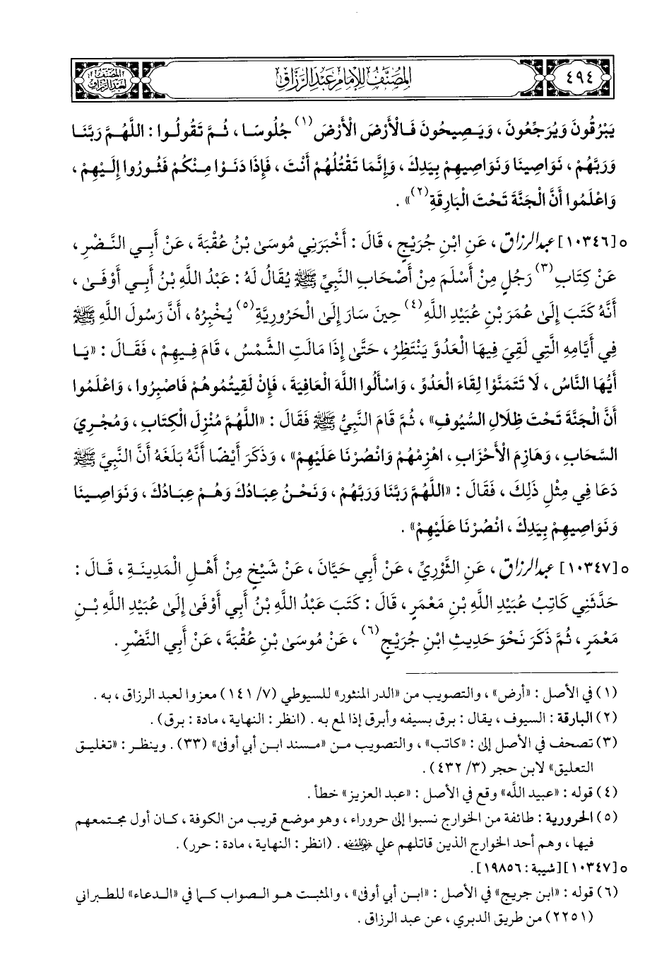 ° [١٠٣٤٦] عبد الرزاق، عَنِ ابْنِ جُرَيْجٍ، قَالَ: أَخْبَرَنِي مُوسَى بْنُ عُقْبَةَ، عَنْ أَبِي النَّضْرِ، عَنْ كِتَابِ (¬٣) رَجُلٍ مِنْ أَسْلَمَ مِنْ أَصْحَابِ النَّبِيِّ - صلى الله عليه وسلم - يُقَالُ لَهُ: عَبْدُ اللَّهِ بْنُ أَبِي أَوْفَى، أَنَّهُ كَتَبَ إِلَى عُمَرَ بْنِ عُبَيْدِ اللَّهِ (¬٤) حِينَ سَارَ إِلَى الْحَرُورِيَّةِ (¬٥) يُخْبِرُهُ، أَنَّ رَسُولَ اللَّهِ - صلى الله عليه وسلم - فِي أَيَّامِهِ الَّتِي لَقِيَ فِيهَا الْعَدُوَّ يَنْتَظِرُ، حَتَى إِذَا مَالَتِ الشَّمْسُ، قَامَ فِيهِمْ، فَقَالَ: "يَا أَيُّهَا النَّاسُ، لَا تَتَمَنَّوْا لِقَاءَ الْعَدُوِّ، وَاسْأَلُوا اللَّهَ الْعَافِيَةَ، فَإِنْ لَقِيتُمُوهُم فَاصْبِرُوا، وَاعْلَمُوا أَنَّ الْجَنَّةَ تَحْتَ ظِلَالِ السُّيُوفِ"، ثُمَّ قَامَ النَّبِيُّ - صلى الله عليه وسلم - فَقَالَ: "اللَّهُمَّ مُنْزِلَ الْكِتَابِ، وَمُجرِيَ السَّحَابِ، وَهَازِمَ الْأَحْزَابِ، اهزِمهُمْ وَانْصُرْنَا عَلَيْهِمْ"، وَذَكَرَ أَيْضًا أَنَّهُ بَلَغَهُ أَنَّ النَّبِيَّ - صلى الله عليه وسلم - دَعَا فِي مِثْلِ ذَلِكَ، فَقَالَ: "اللَّهُمَّ رَبَّنَا وَرَبَّهُمْ، وَنَحْنُ عِبَادُكَ وَهُمْ عِبَادُكَ، وَنَوَاصِينَا وَنَوَاصِيهِمْ بِيَدِكَ، انْصُرْنَا عَلَيْهِمْ".
