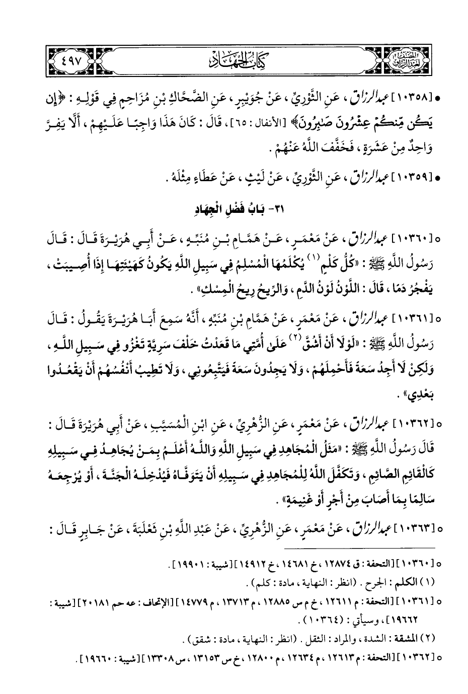 ° [١٠٣٦٠] عبد الرزاق، عَنْ مَعْمَرٍ، عَنْ هَمَّامِ بْنِ مُنَبِّهِ، عَنْ أَبِي هُرَيْرَةَ قَالَ: قَالَ رَسُولُ اللَّهِ - صلى الله عليه وسلم -: "كُلُّ كَلْمٍ (¬١) يُكْلَمُهَا الْمُسْلِمُ فِي سَبِيلِ اللهِ يَكُونُ كَهَيْئَتِهَا إِذَا أُصِيبَتْ، يَفْجُرُ دَمًا، قَالَ: اللَّوْنُ لَوْنُ الدَّمِ، وَالرِّيحُ رِيحُ الْمِسْكِ".