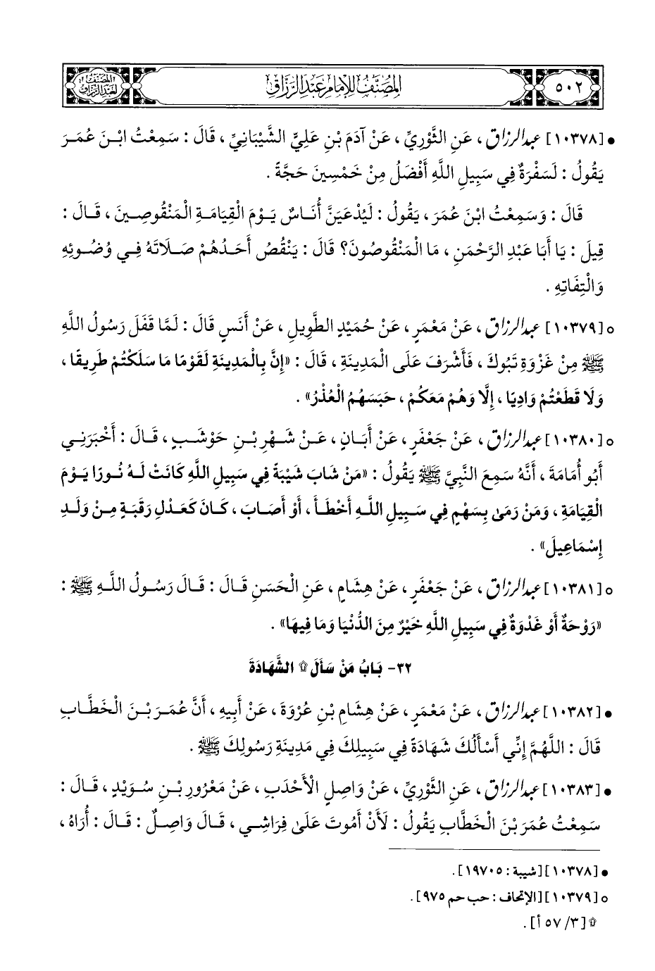 ° [١٠٣٨٠] عبد الرزاق، عَنْ جَعْفَرٍ، عَنْ أَبَانٍ، عَنْ شَهْرِ بْنِ حَوْشَبٍ، قَالَ: أَخْبَرَنِي أَبُو أُمَامَةَ، أَنَّهُ سَمِعَ النَّبِيَّ - صلى الله عليه وسلم - يَقُولُ: "مَنْ شَابَ شَيْبَةً فِي سَبِيلِ اللَّهِ كَانَتْ لَهُ نُورًا يَوْمَ الْقِيَامَةِ، وَمَنْ رَمَى بِسَهْمٍ فِي سَبِيلِ اللَّهِ أَخْطَأَ، أَوْ أَصَابَ، كَانَ كَعَدْلِ رَقَبَةٍ مِنْ وَلَدِ إِسْمَاعِيلَ".