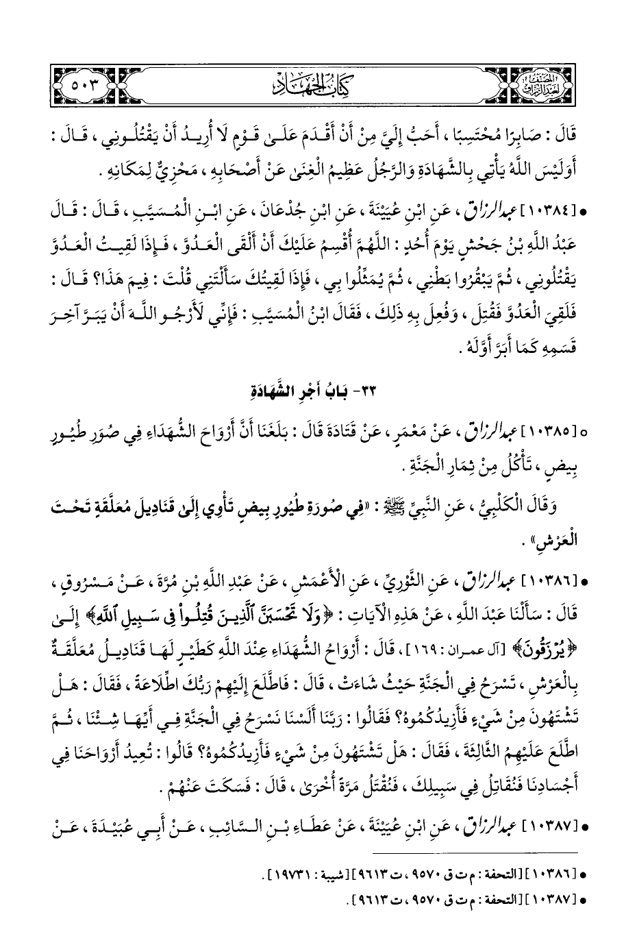 • [١٠٣٨٦] عبد الرزاق، عَنِ الثَّوْريِّ، عَنِ الْأَعْمَشِ، عَنْ عَبْدِ الله بْنِ مُرَّةَ، عَنْ مَسْرُوقٍ، قَالَ: سَأَلْنَا عَبْدَ اللَّهِ، عَنْ هَذِهِ الْآيَاتِ: {وَلَا تَحْسَبَنَّ ألَّذِينَ قُتِلُوا فِي سَبِيلِ اللَّهِ} إِلَى {يُززَقُونَ} [آل عمران: ١٦٩]، قَالَ: أَرْوَاحُ الشُّهَدَاءِ عِنْدَ اللَّهِ كَطَيْرٍ لَهَا قَنَادِيلُ مُعَلَّقَةٌ بِالْعَرْشِ، تَشرَحُ فِي الْجَنَّةِ حَيْثُ شَاءَتْ، قَالَ: فَاطَّلَعَ إِلَيْهِمْ رَبُّكَ اطلَاعَةً، فَقَالَ: هَلْ تَشْتَهُونَ مِنْ شَيءٍ فَأَزِيدُكُمُوهُ؟ فَقَالُوا: رَبَّنَا أَلَسْنَا نَسْرَحُ فِي الْجَنَّةِ فِي أَيِّهَا شِئْنَا، ثُمَّ اطَّلَعَ عَلَيْهِمُ الثَّالِثَةَ، فَقَالَ: هَلْ تَشْتَهُونَ مِنْ شَيءٍ فَأَزِيدُكُمُوهُ؟ قَالُوا: تُعِيدُ أَرْوَاحَنَا فِي أَجْسَادِنَا فَنُقَاتِلُ فِي سَبِيلِكَ، فَنُقْتَلُ مَرَّةً أُخْرَى، قَالَ: فَسَكَتَ عَنْهُمْ.