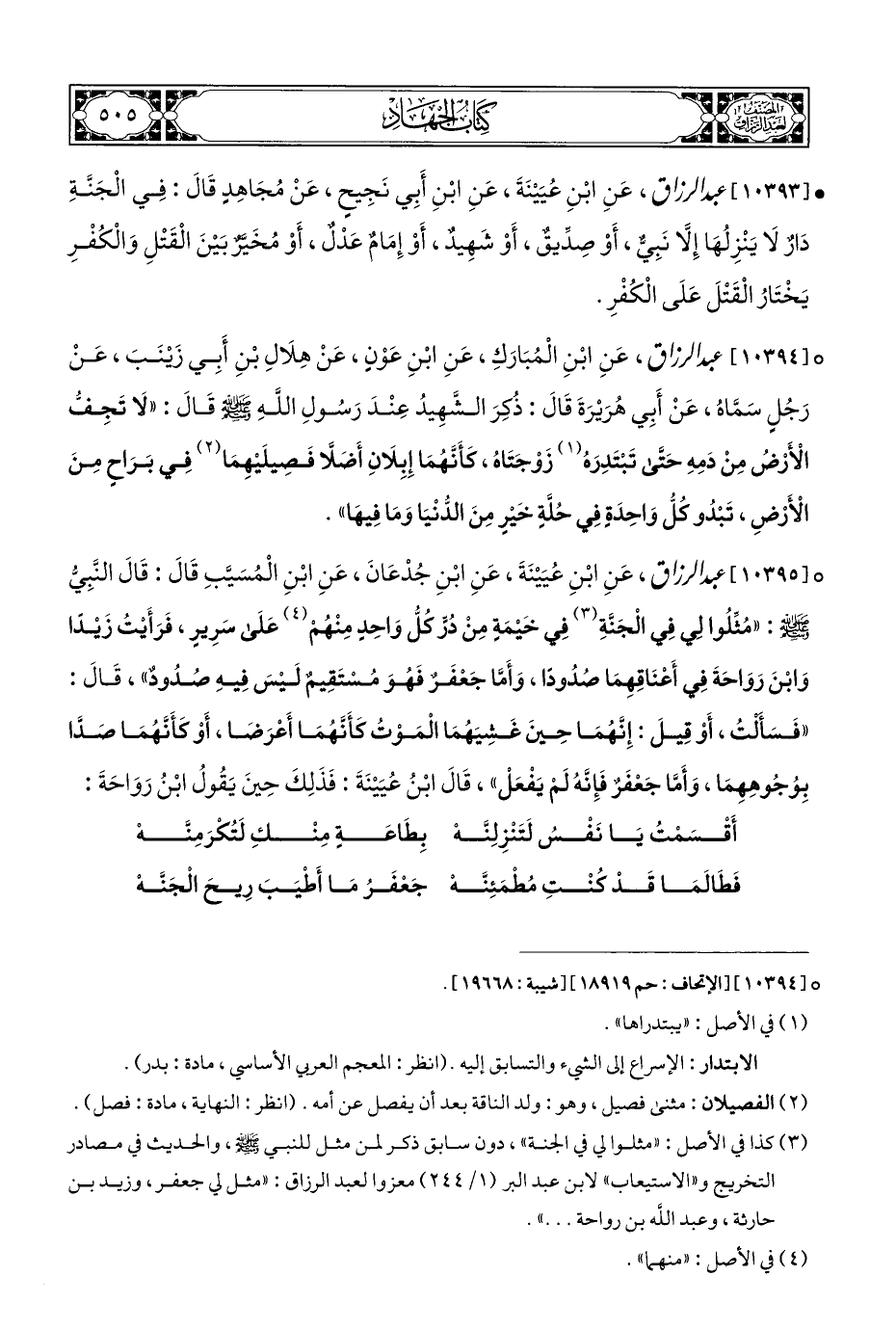 ° [١٠٣٩٥] عبد الرزاق، عَنِ ابْنِ عُيَيْنَةَ، عَنِ ابْنِ جُدْعَانَ، عَنِ ابْنِ الْمُسَيَّبِ قَالَ: قَالَ النَّبِيُّ - صلى الله عليه وسلم -: "مُثِّلُوا لِي فِي الْجَنَّةِ (¬٣) فِي خَيْمَةٍ مِنْ دُرٍّ كُلُّ وَاحِدٍ مِنْهُمْ (¬٤) عَلَى سَرِيرٍ، فَرَأَيْتُ زَيْدًا وَابْنَ رَوَاحَةَ فِي أَعْنَاقِهِمَا صُدُودًا، وَأَمَّا جَعْفَرُ فَهُوَ مُسْتَقِيمٌ لَيْسَ فِيهِ صُدُودٌ"، قَالَ: "فَسَألتُ، أَوْ قِيلَ: إِنَّهُمَا حِينَ غَشِيَهُمَا الْمَوْتُ كَأَنَّهُمَا أَعْرَضَا، أَوْ كَأَنَّهُمَا صَدَّا بِوُجُوهِهِمَا، وَأَمَّا جَعْفَرٌ فَإِنَّهُ لَمْ يَفْعَلْ"، قَالَ ابْنُ عُيَيْنَةَ: فَذَلِكَ حِينَ يَقُولُ ابْنُ رَوَاحَةَ: