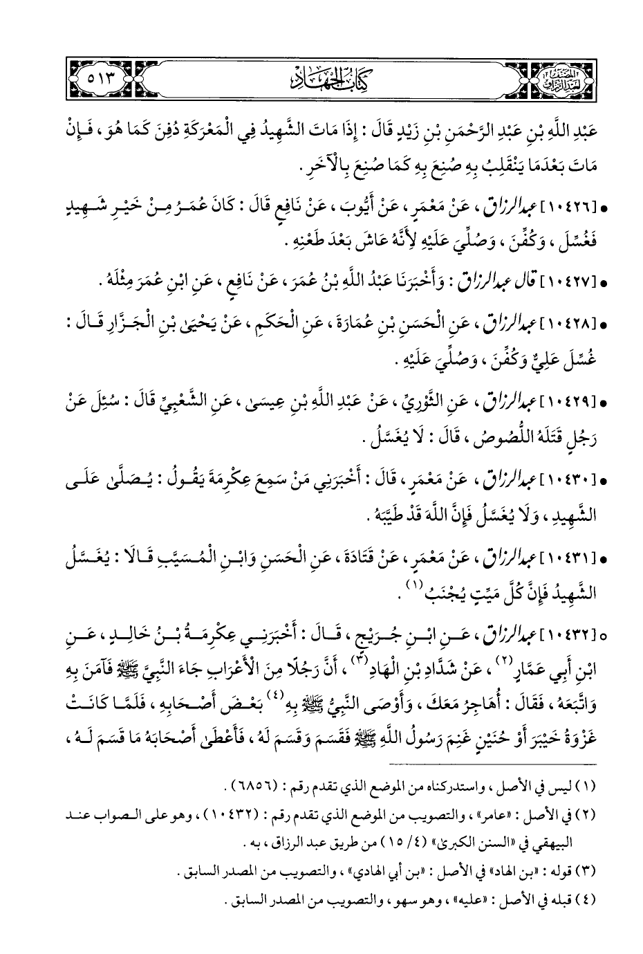 • [١٠٤٣١] عبد الرزاق، عَنْ مَعْمَرٍ، عَنْ قَتَادَةَ، عَنِ الْحَسَنِ وَابْنِ الْمُسَيَّبِ قَالَا: يُغَسَّلُ الشَّهِيدُ فَإِنَّ كُلَّ مَيِّتٍ يُجْنَبُ (¬١).