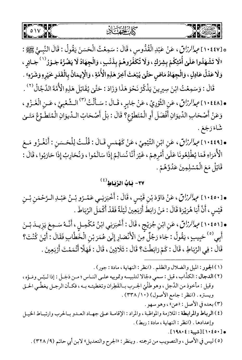 (¬٤) الرباط والمرابطة: الملازمة والمواظبة، والمراد: الإقامة على جهاد العدو بالحرب وارتباط الخيل وإعدادها. (انظر: النهاية، مادة: ربط).