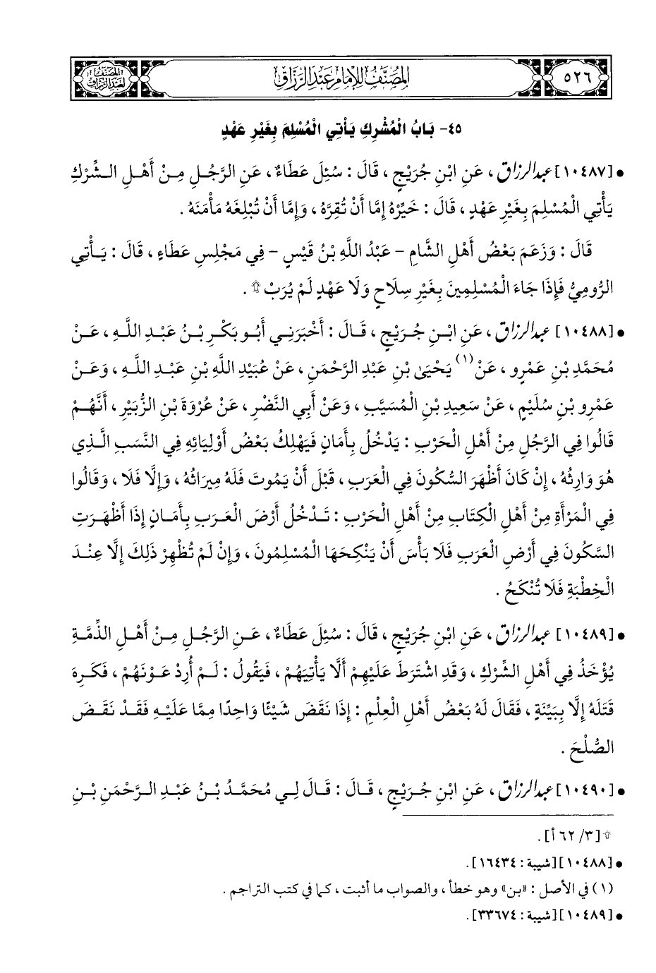 • [١٠٤٨٨] عبد الرزاق، عَنِ ابْنِ جُرَيْجٍ، قَالَ: أَخْبَرَنِي أَبُو بَكْرِ بْنُ عَبْدِ اللهِ، عَنْ مُحَمَّدِ بْنِ عَمْرٍو، عَنْ (¬١) يَحْيَى بْنِ عَبْدِ الرَّحْمَنِ، عَنْ عُبَيْدِ اللَّهِ بْنِ عَبْدِ اللهِ، وَعَنْ عَمْرِو بْنِ سُلَيْمٍ، عَنْ سَعِيدِ بْنِ الْمُسَيبِ، وَعَنْ أَبِي النَّضْرِ، عَنْ عُرْوَةَ بْنِ الزُّبَيْرِ، أَنَّهُمْ قَالُوا فِي الرَّجُلِ مِنْ أَهْلِ الْحَرْبِ: يَدْخُلُ بِأَمَانٍ فَيَهْلِكُ بَعْضُ أَوْلِيَائِهِ فِي النَّسَبِ الَّذِي هُوَ وَارِثُهُ، إِنْ كَانَ أَظْهَرَ السُّكُونَ فِي الْعَرَبِ، قَبْلَ أَنْ يَمُوتَ فَلَهُ مِيرَاثُهُ، وإلَّا فَلَا، وَقَالُوا فِي الْمَرْأَةِ مِنْ أَهْلِ الْكِتَابِ مِنْ أَهْلِ الْحَرْبِ: تَدْخُلُ أَرْضَ الْعَرَبِ بِأَمَانٍ إِذَا أَظْهَرَتِ السَّكُونَ فِي أَرْضِ الْعَرَبِ فَلَا بَأْسَ أَنْ يَنْكِحَهَا الْمُسْلِمُونَ، وإِنْ لَمْ تُظْهِرْ ذَلِكَ إِلَّا عِنْدَ الْخِطْبَةِ فَلَا تُنْكَحُ.