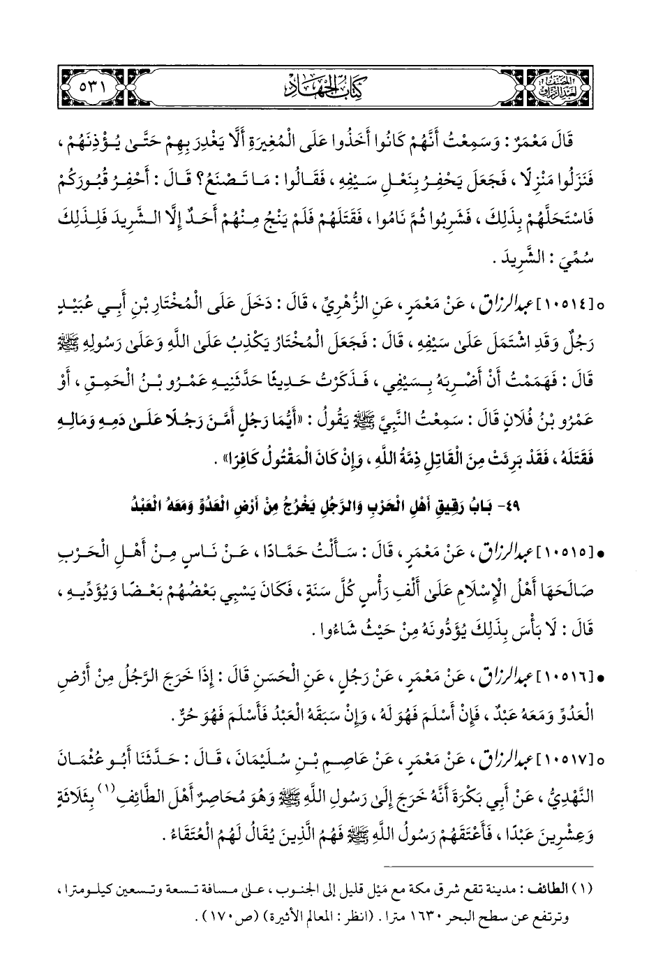 ° [١٠٥١٧] عبد الرزاق، عَنْ مَعْمَرٍ، عَنْ عَاصِمِ بْنِ سُلَيْمَانَ، قَالَ: حَدَّثَنَا أَبُو عُثْمَانَ النَّهْدِيُّ، عَنْ أَبِي بَكْرَةَ أَنَّهُ خَرَجَ إِلَى رَسُولِ اللَّهِ - صلى الله عليه وسلم - وَهُوَ مُحَاصِرٌ أَهْلَ الطَّائِفِ (¬١) بِثَلَاثَةٍ وَعِشْرِينَ عَبْدًا، فَأَعْتَقَهُمْ رَسُولُ اللَّهِ - صلى الله عليه وسلم - فَهُمُ الَّذِينَ يُقَالُ لَهُمُ الْعُتَقَاءُ.