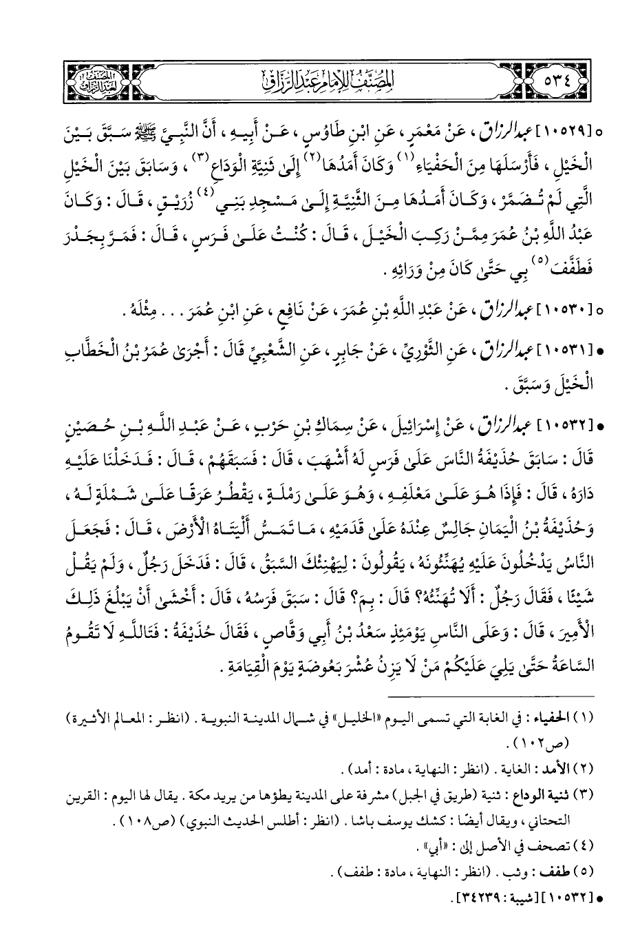 ° [١٠٥٢٩] عبد الرزاق، عَنْ مَعْمَرٍ، عَنِ ابْنِ طَاوُسٍ، عَنْ أَبِيهِ، أَنَّ النَّبِيَّ - صلى الله عليه وسلم - سَبَّقَ بَيْنَ الْخَيْلِ، فَأَرْسَلَهَا مِنَ الْحَفْيَاءِ (¬١) وَكَانَ أَمَدُهَا (¬٢) إِلَى ثَنِيَّةِ الْوَدَاعِ (¬٣)، وَسَابَقَ بَيْنَ الْخَيْلِ الَّتِي لَمْ تُضَمَّرْ، وَكَانَ أَمَدُهَا مِنَ الثَّنِيَّةِ إِلَى مَسْجِدِ بَنِي (¬٤) زُرَيْقٍ، قَالَ: وَكَانَ عَبْدُ اللَّهِ بْنُ عُمَرَ مِمَّنْ رَكِبَ الْخَيْلَ، قَالَ: كُنْتُ عَلَى فَرَسٍ، قَالَ: فَمَرَّ بِجَدْرَ فَطَفَّفَ (¬٥) بِي حَتَّى كَانَ مِنْ وَرَائِهِ.